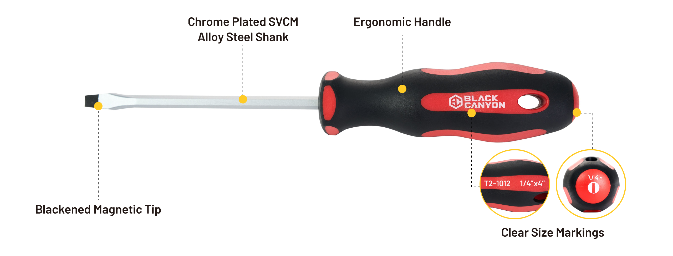 Built to last, with a robust Silicon Vanadium Chrome Magnesium (SVCM) alloy steel shank for superior strength and wear resistance. The chrome-plated finish enhances corrosion resistance, while the high-torque ergonomic handle made from dual-material PP and TPV provides a secure and comfortable grip. These tools have been tested to meet the ASME B107.600 standard for professional-grade hand tools.