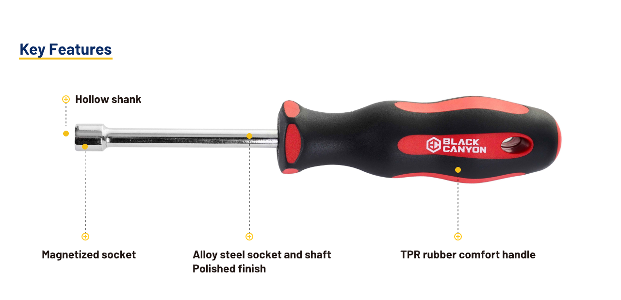 6-Piece SAE Nut Driver Set, Magnetic Socket, Hollow Shank, Comfort Grip