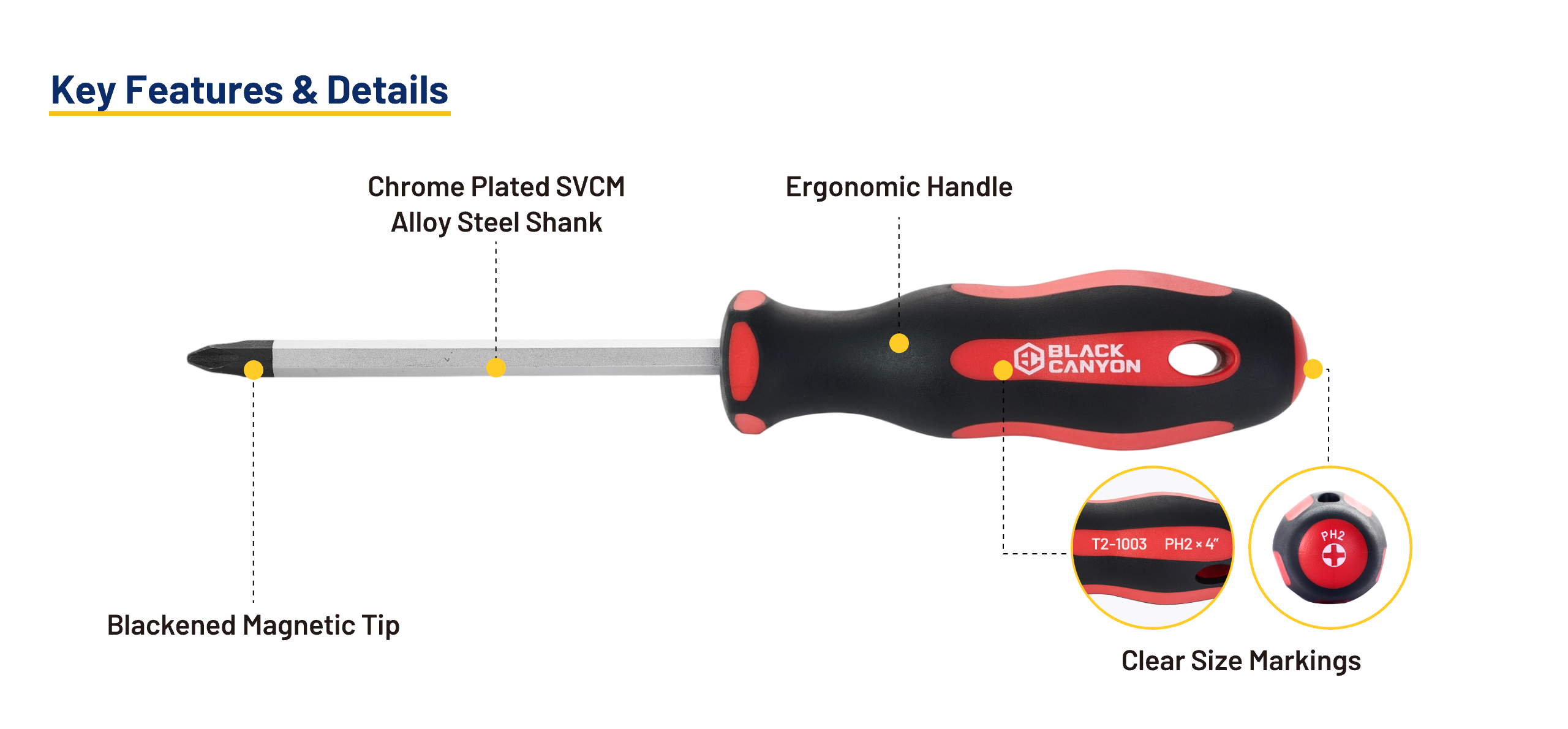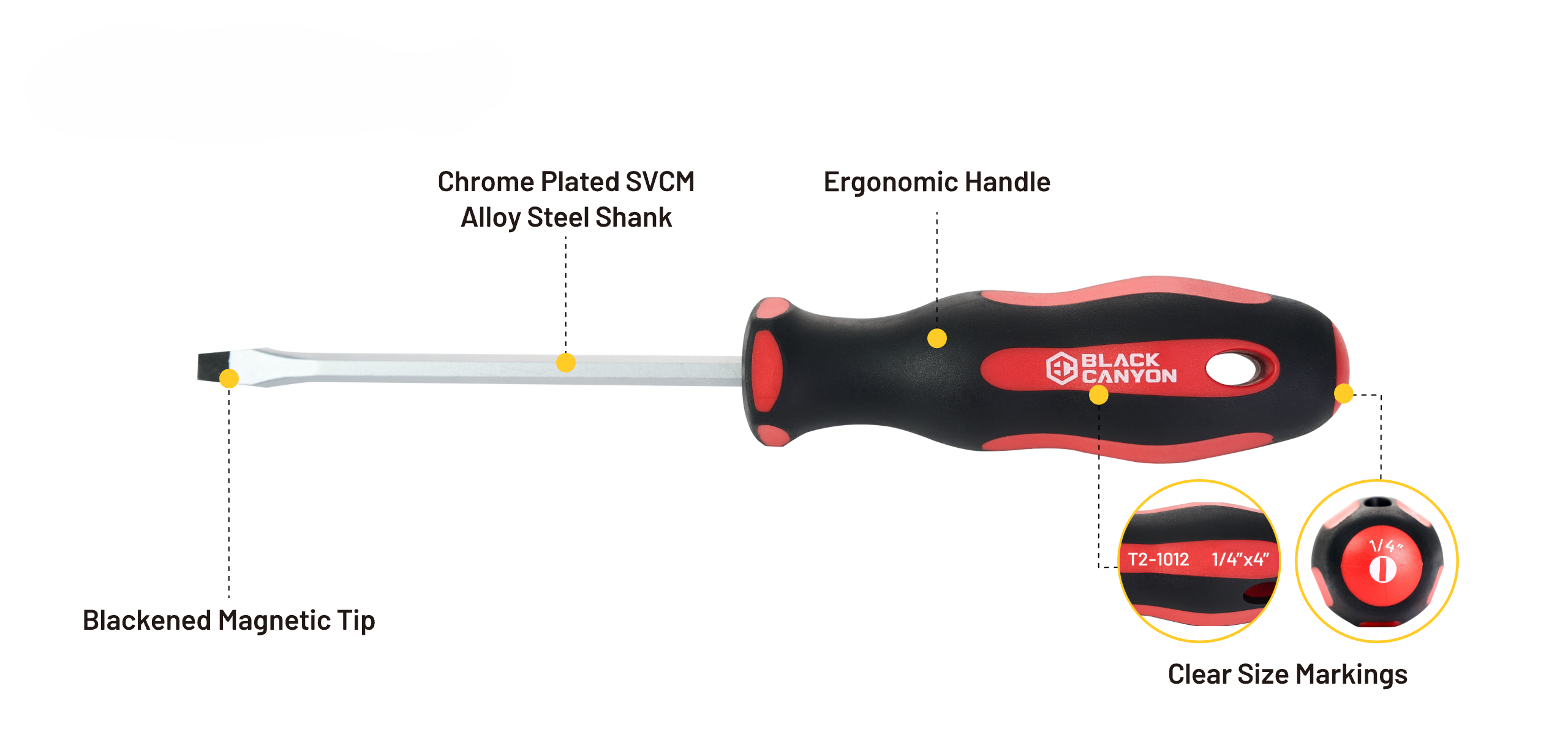 Built to last, with a robust Silicon Vanadium Chrome Magnesium (SVCM) alloy steel shank for superior strength and wear resistance. The chrome-plated finish enhances corrosion resistance, while the high-torque ergonomic handle made from dual-material PP and TPV provides a secure and comfortable grip. These tools have been tested to meet the ASME B107.600 standard for professional-grade hand tools.