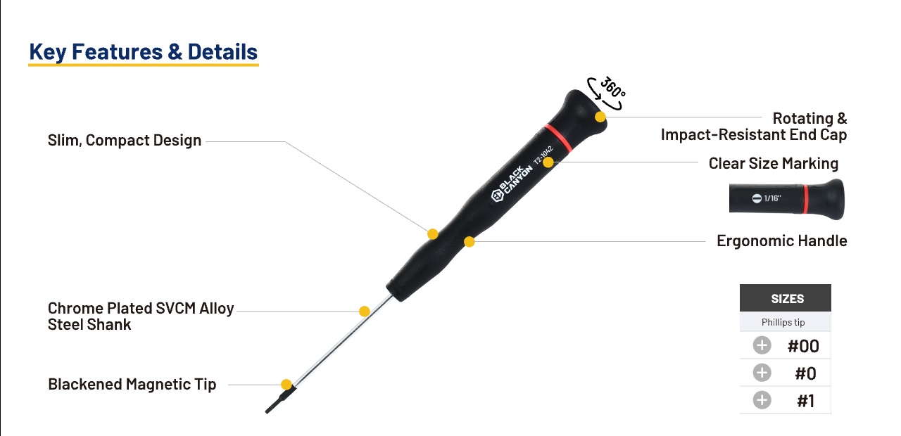 Featuring a 3/32" narrow round shank and 2-11/32" long shaft, this precision screwdriver provides easy access to tight recesses in compact assemblies, capable of reaching recessed or deeply embedded screws without obstructing visibility or access. The 360° smooth rotation end cap allows for precise, one-handed operation.