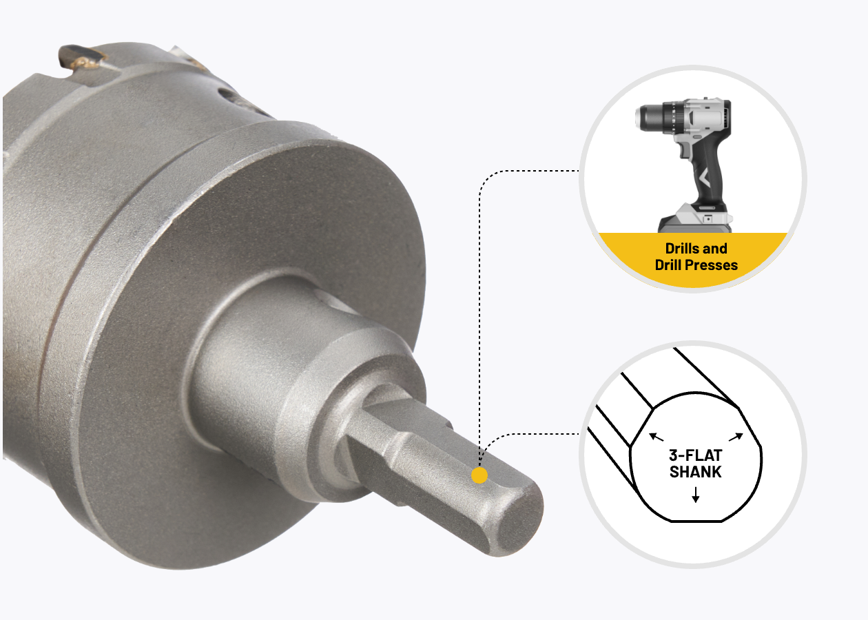 The 3/8" shank with three flats enhances grip stability in drill chucks, improving control and reducing slippage. Compatible with a range of drills and drill presses, it provides versatility across different tools.