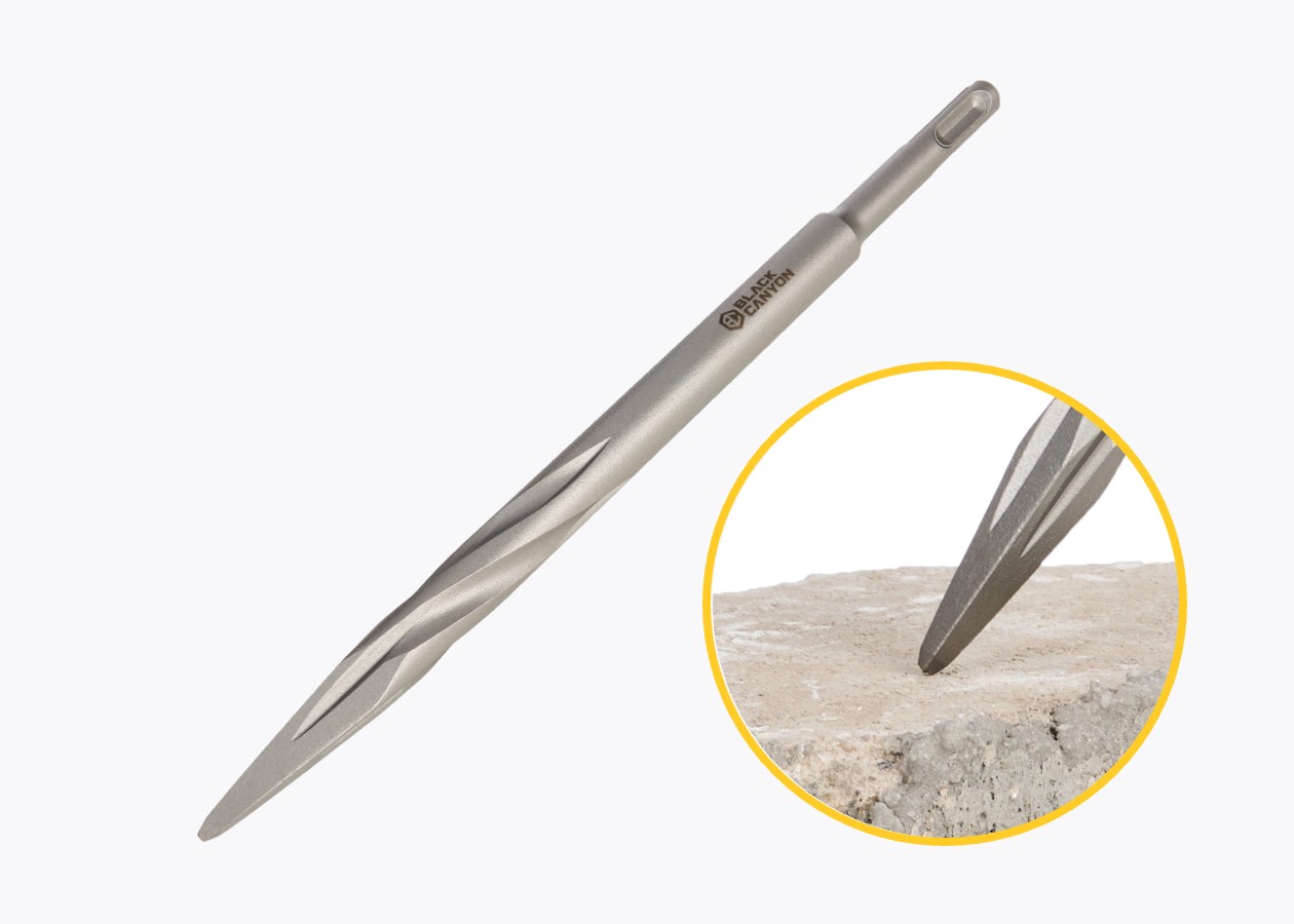 Featuring a uniquely shaped head with a star-point twist tip, the point chisel is self-sharpening and less prone to jamming for greater productivity. Use it for starting holes in concrete slabs, chipping and breaking.