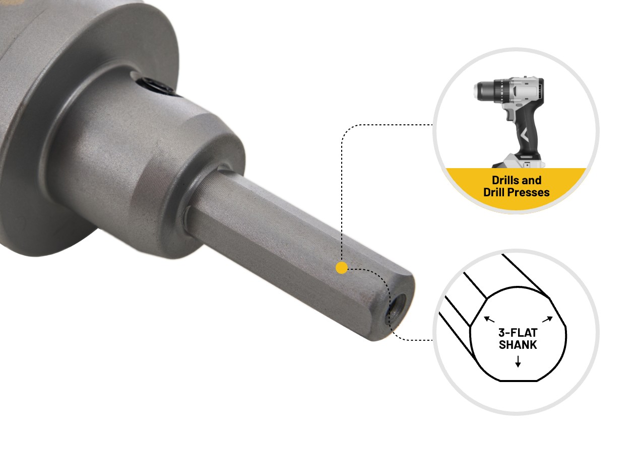 The 3/8" shank with three flats enhances grip stability in drill chucks, improving control and reducing slippage. Compatible with a range of drills and drill presses, it provides versatility across different tools.