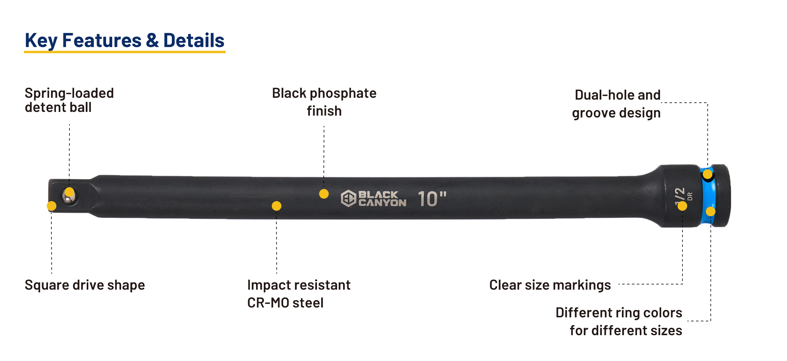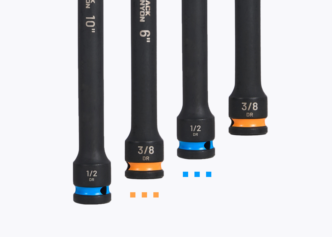 Each extension has a permanent, high-visibility, laser-etched socket size, and various drive sizes are marked by different colors for quick and easy identification even after heavy use, allowing technicians to work efficiently without wasting time searching for the correct size.