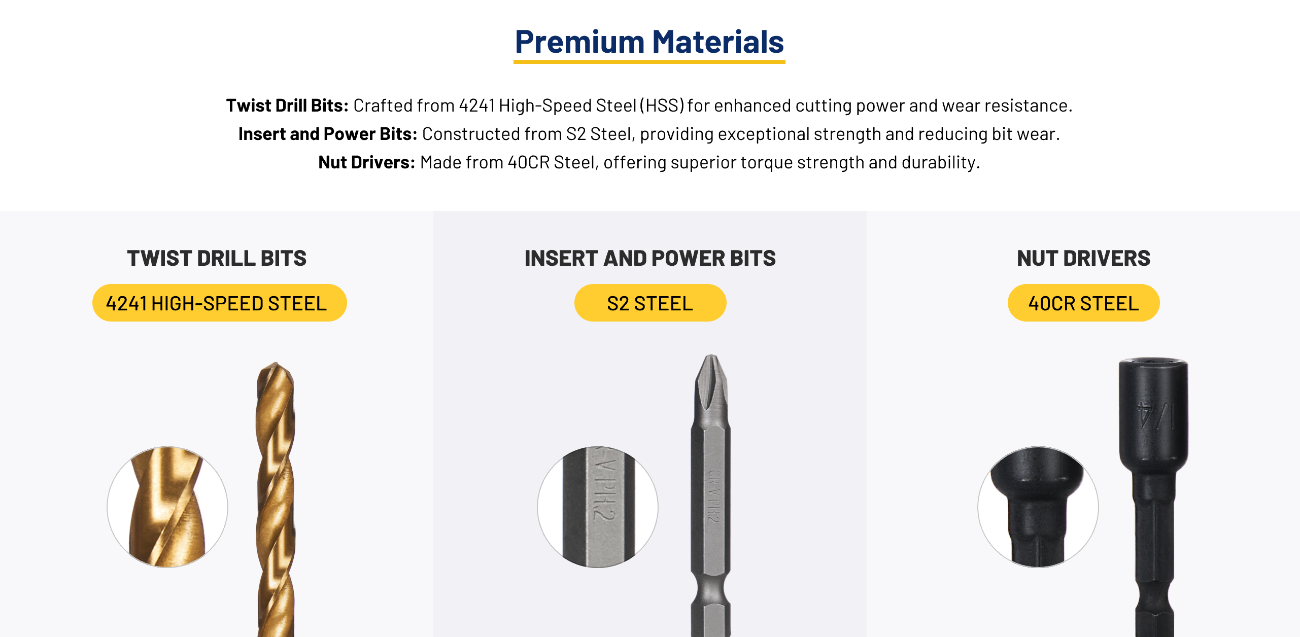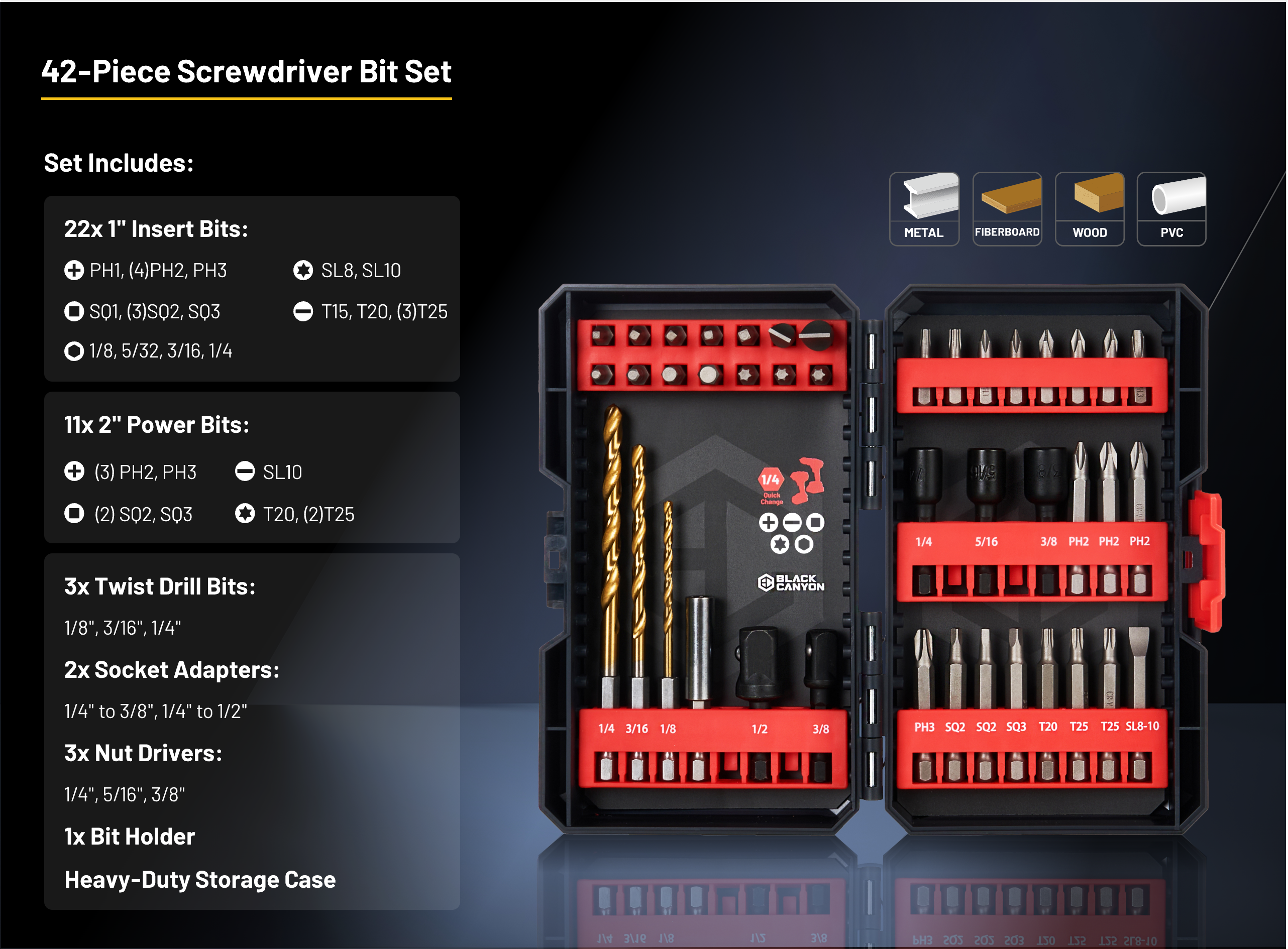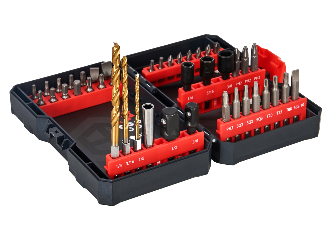 The set comes with a heavy-duty storage case that features a secure latch, keeping the bits neatly organized and easily accessible. Its compact design ensures portability, making it convenient for both on-site work and general storage in the workshop.