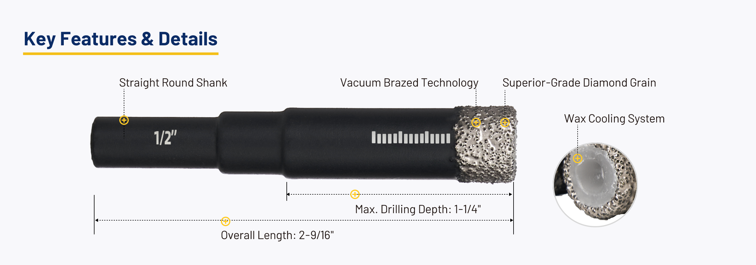 Each bit includes an internal wax lubricant that activates under heat, helping to cool the bit during use. This enhances cutting performance, prolongs the life of the tool, minimizes overheating risks and allows for dry drilling—no coolant needed.