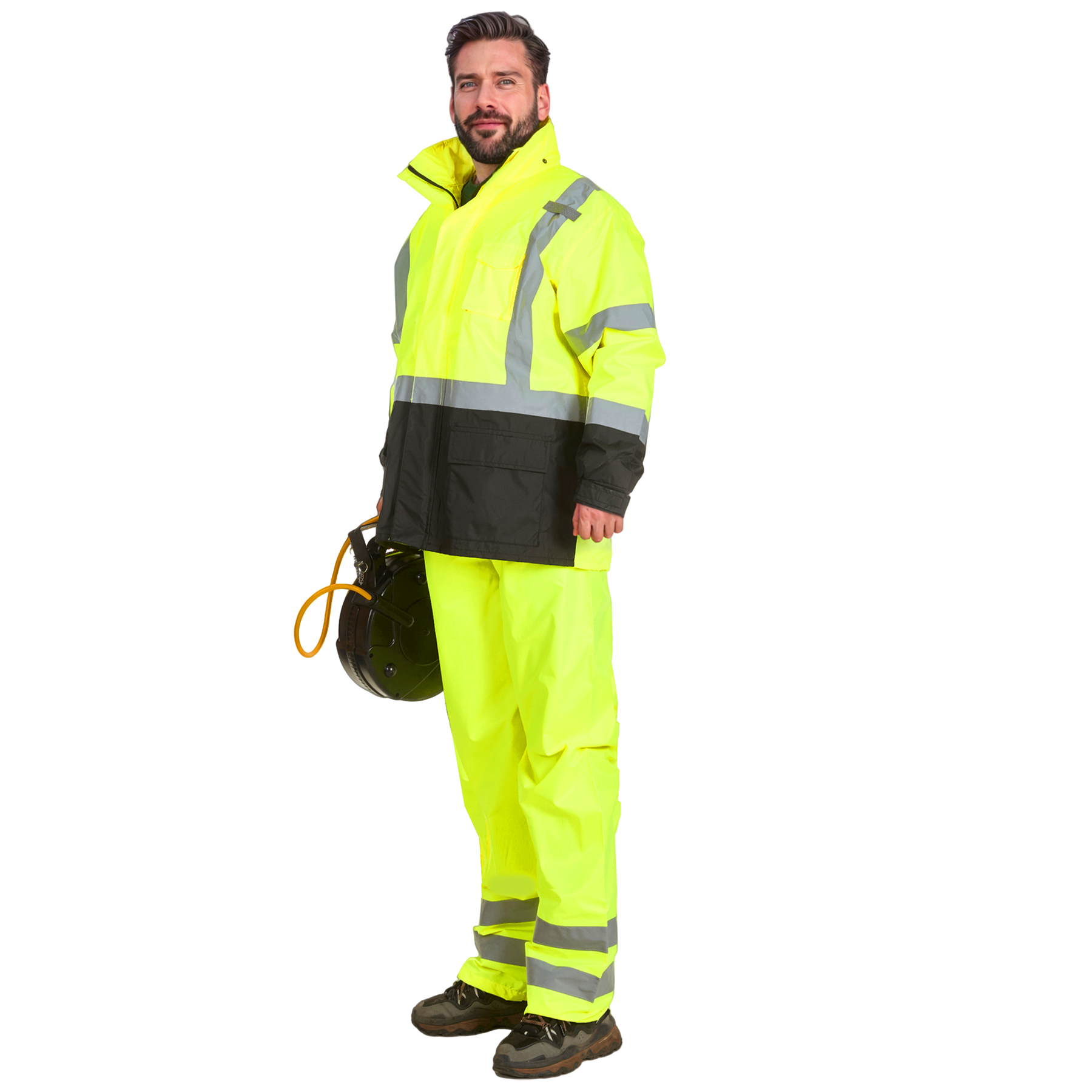 This rain suit features two (2) vertical stripes across the shoulders, one (1) horizontal stripe around the waist, two (2) horizontal stripes around each arm and two (2) horizontal stripes around each leg, ensuring high-visibility recognition from all angles. The suit's vibrant and high-contrast color makes it ideal for low-light or high-risk environments.