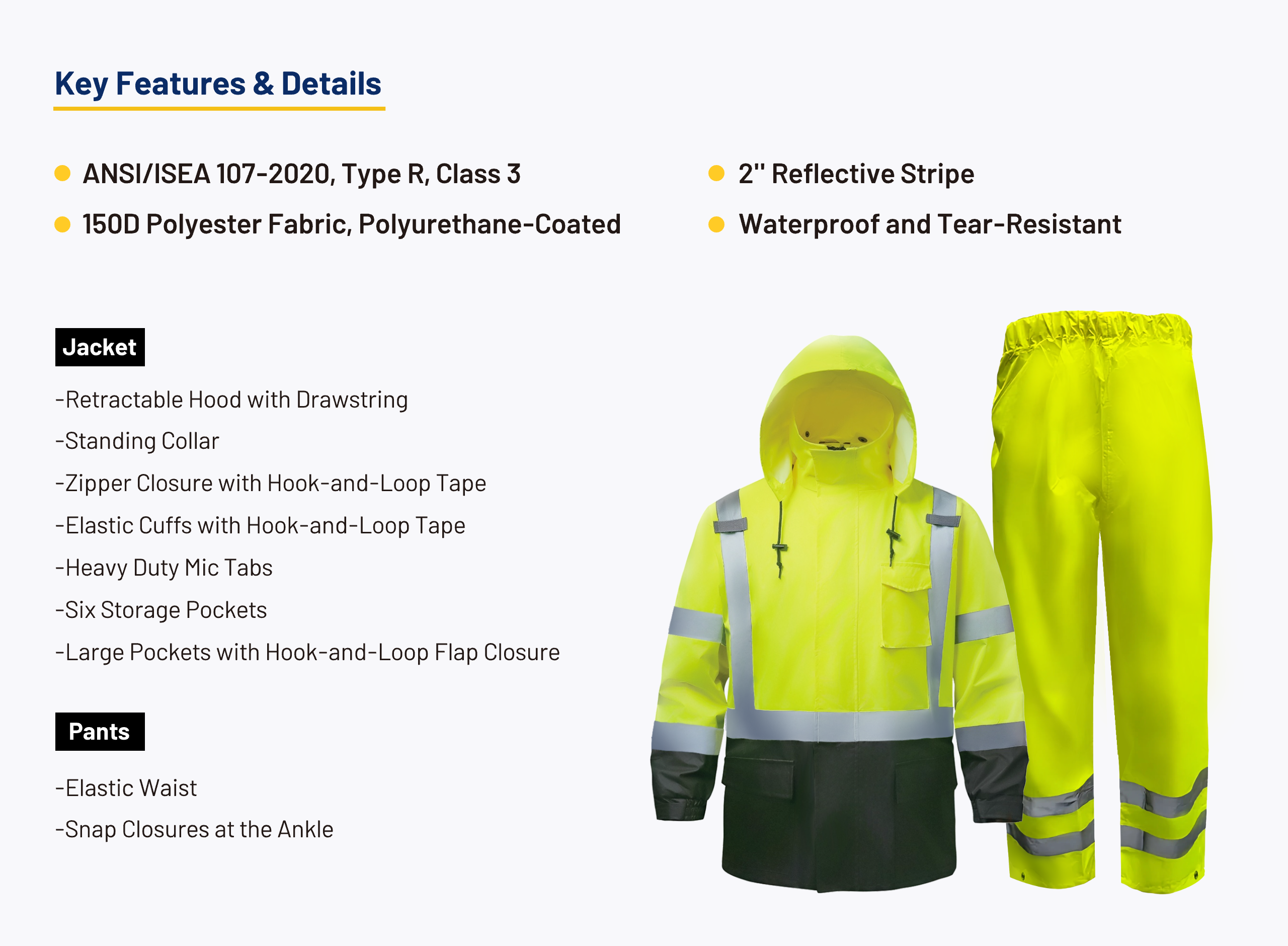 This rain suit meets visibility safety standards (Type R, Class 3), ensuring worker safety in high-risk environments, such as roadways and construction zones.