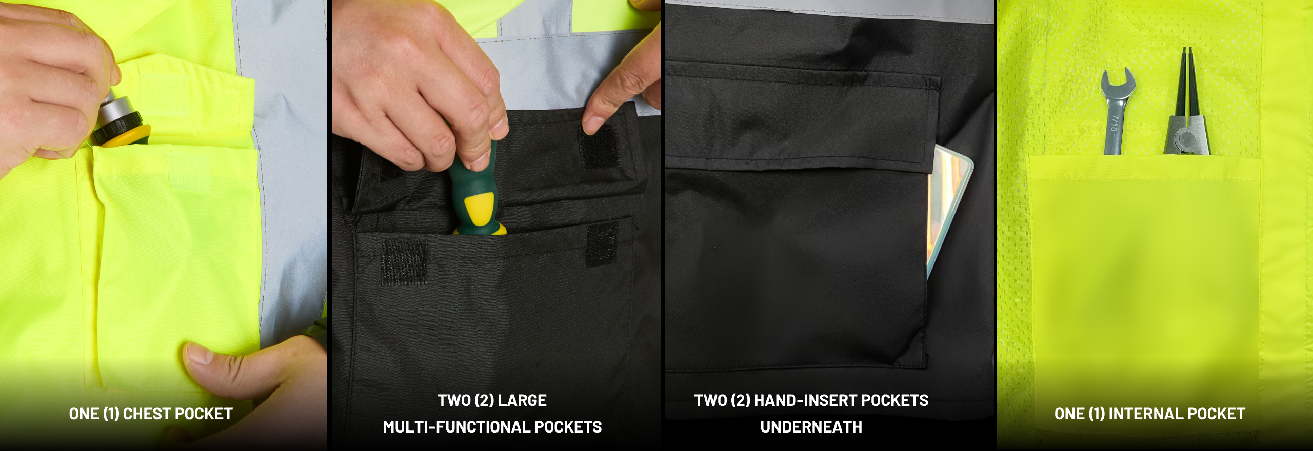 Featuring six (6) reinforced pockets, this rain suit provides ample storage for tools, personal items or equipment, keeping essentials easily accessible on the job.