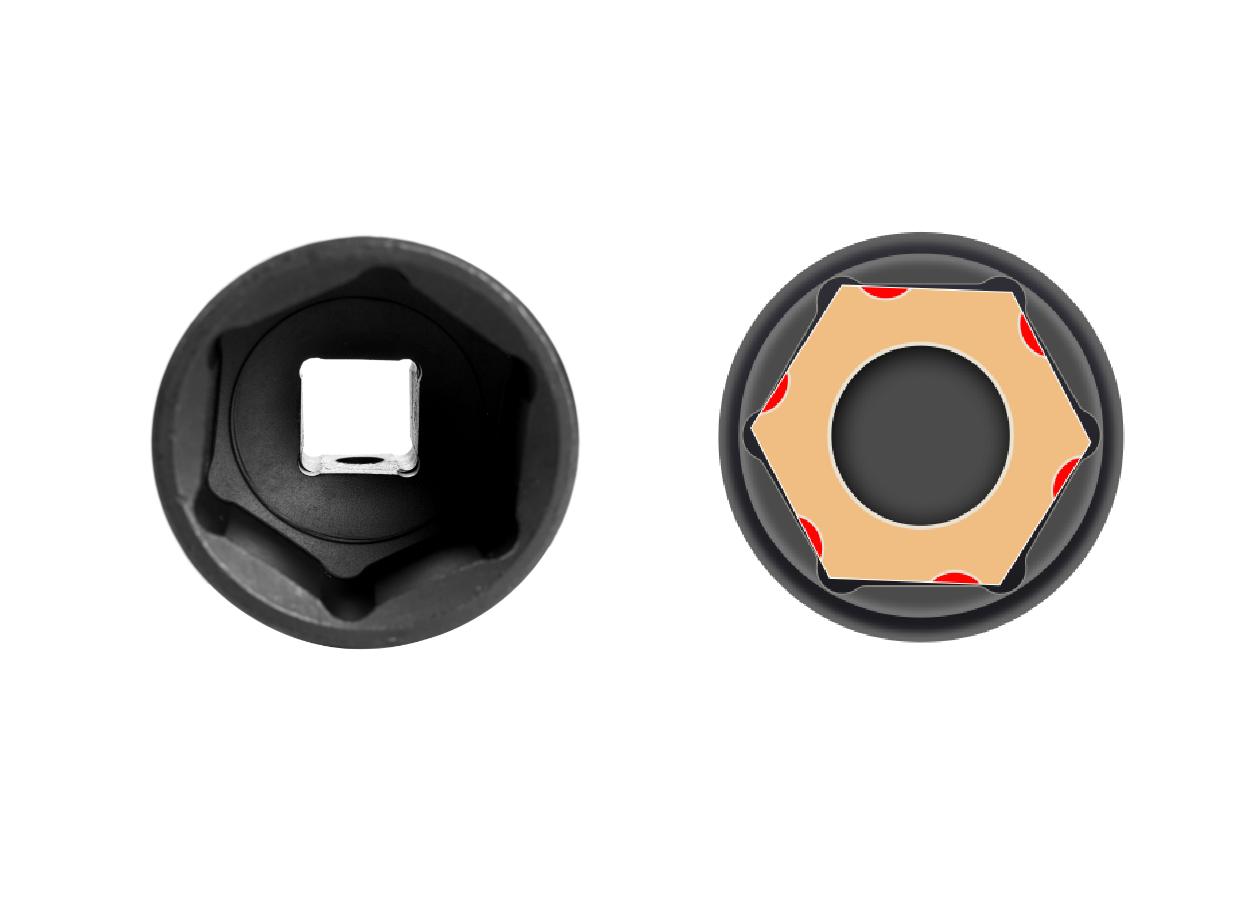 The 6-point hexagonal socket design ensures maximum contact with fasteners, and the chamfered opening allows for easy insertion. Radiused corners prevent fastener round-off by applying force to the fastener's flat sides, rather than its corners.