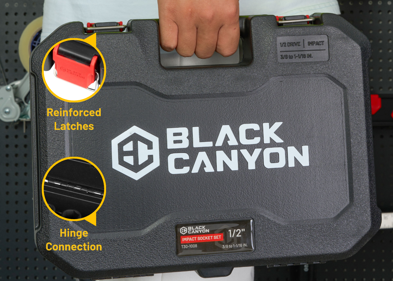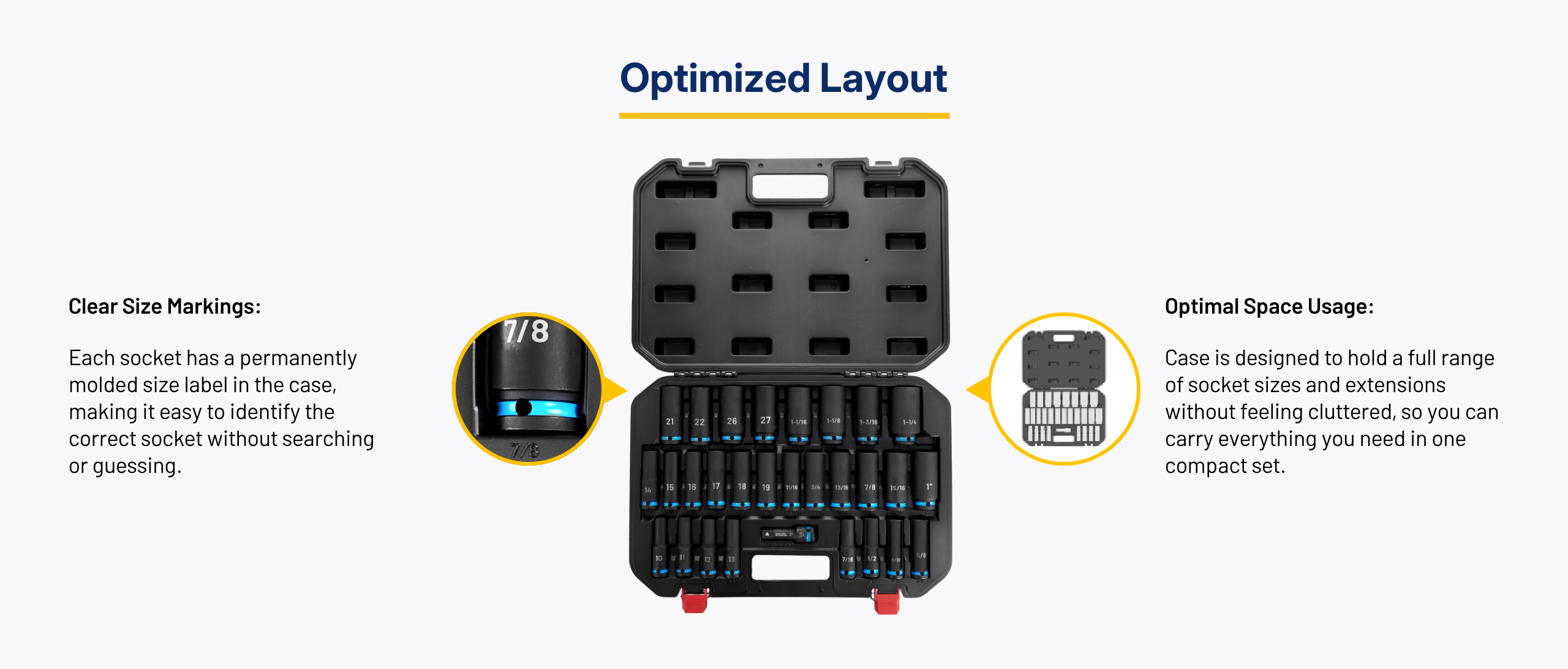 This high-quality, impact-resistant case with portable handle and reinforced latches and hinge connection is great for stacking, storing and transporting. It keeps sockets securely in place and prevents loosening or misalignment, even after prolonged use or extensive transport.