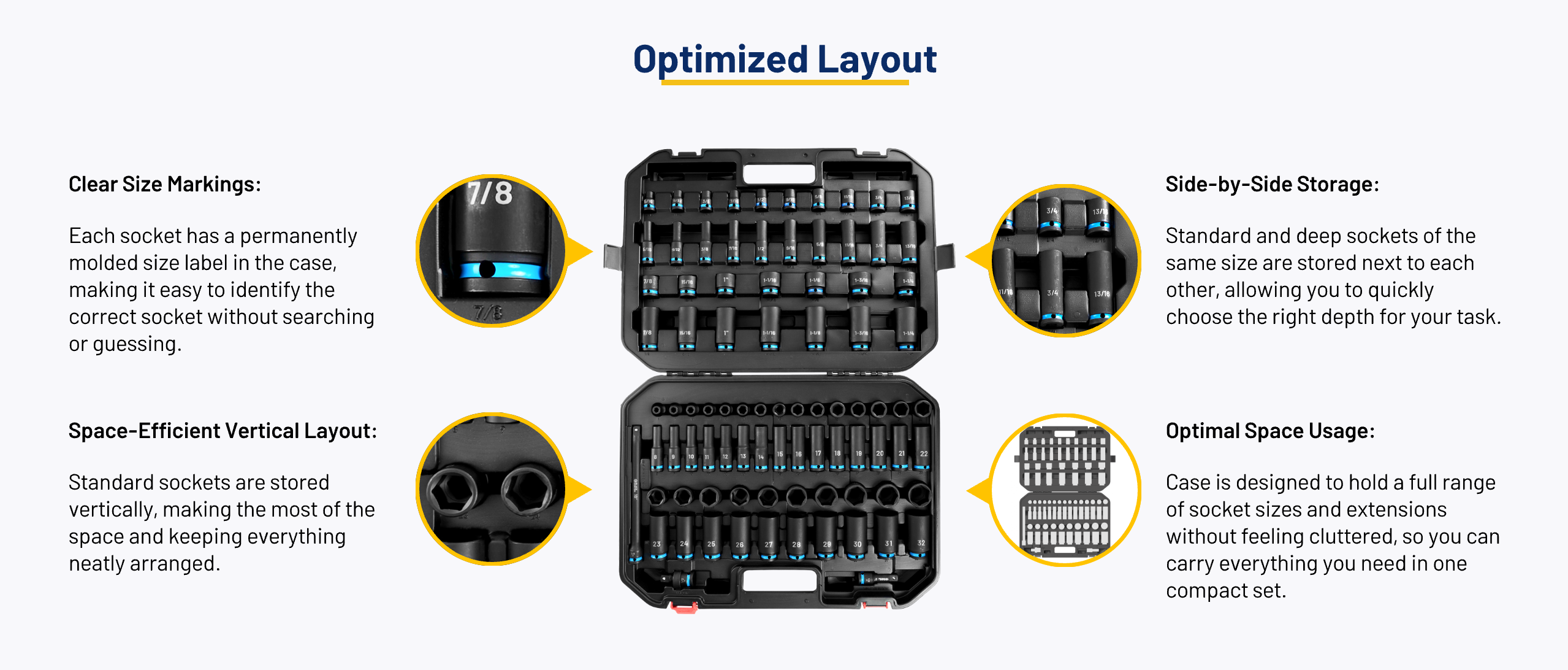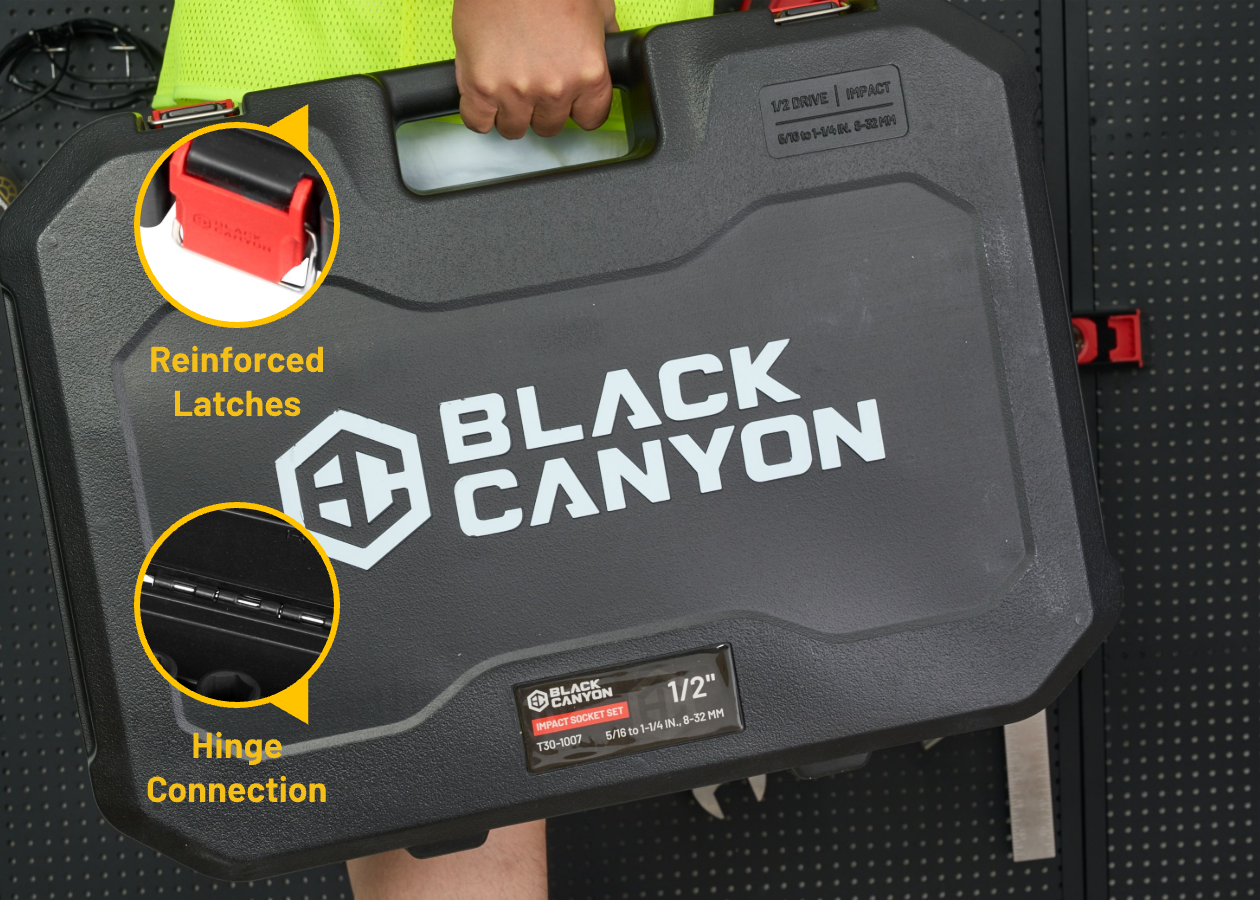 This high-quality, impact-resistant case with portable handle and reinforced latches and hinge connection is great for stacking, storing and transporting. It keeps sockets securely in place and prevents loosening or misalignment, even after prolonged use or extensive transport.