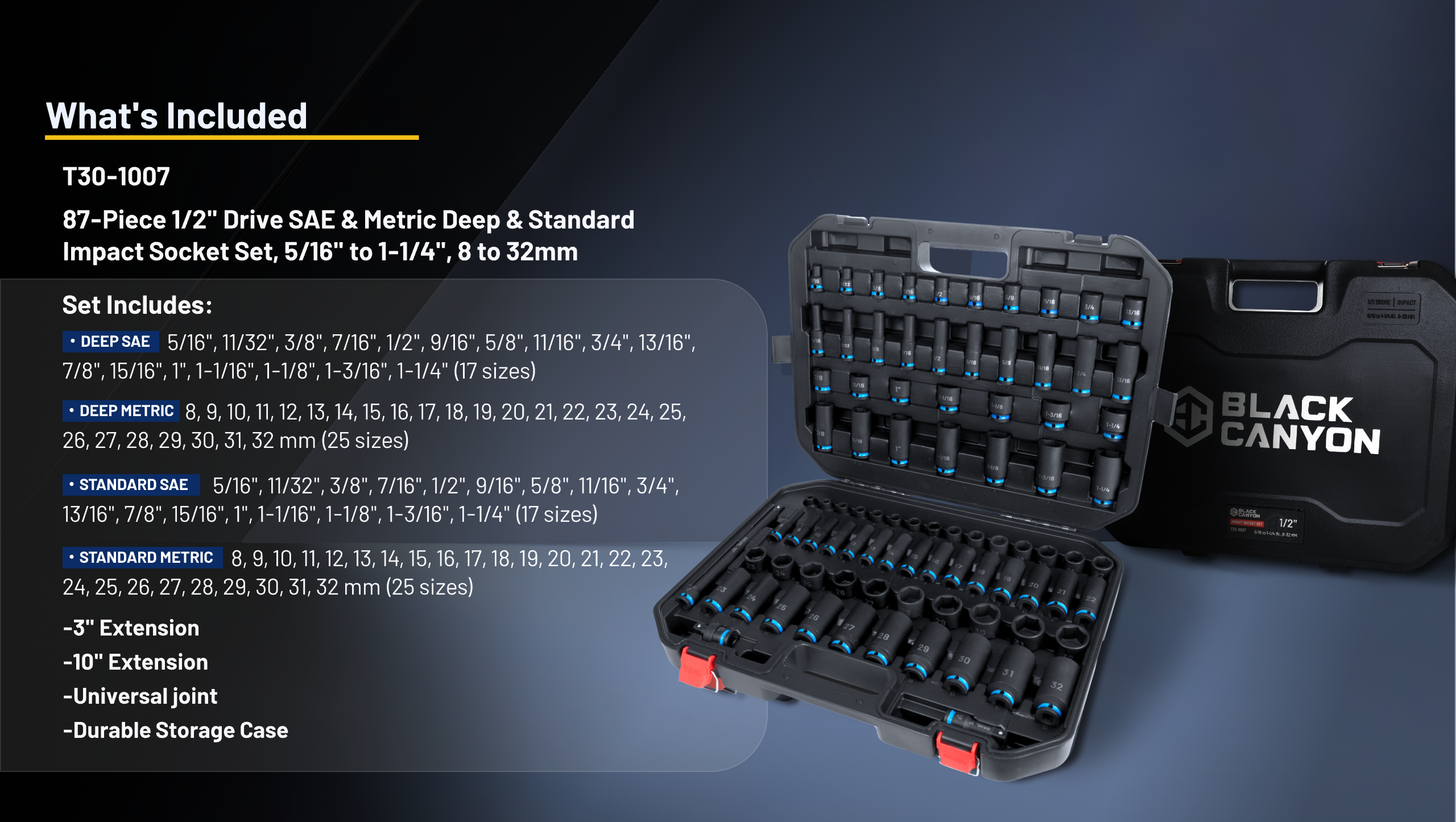 1/2 in Drive Impact Socket Set, 6-Point, Metric/SAE, 87 Piece