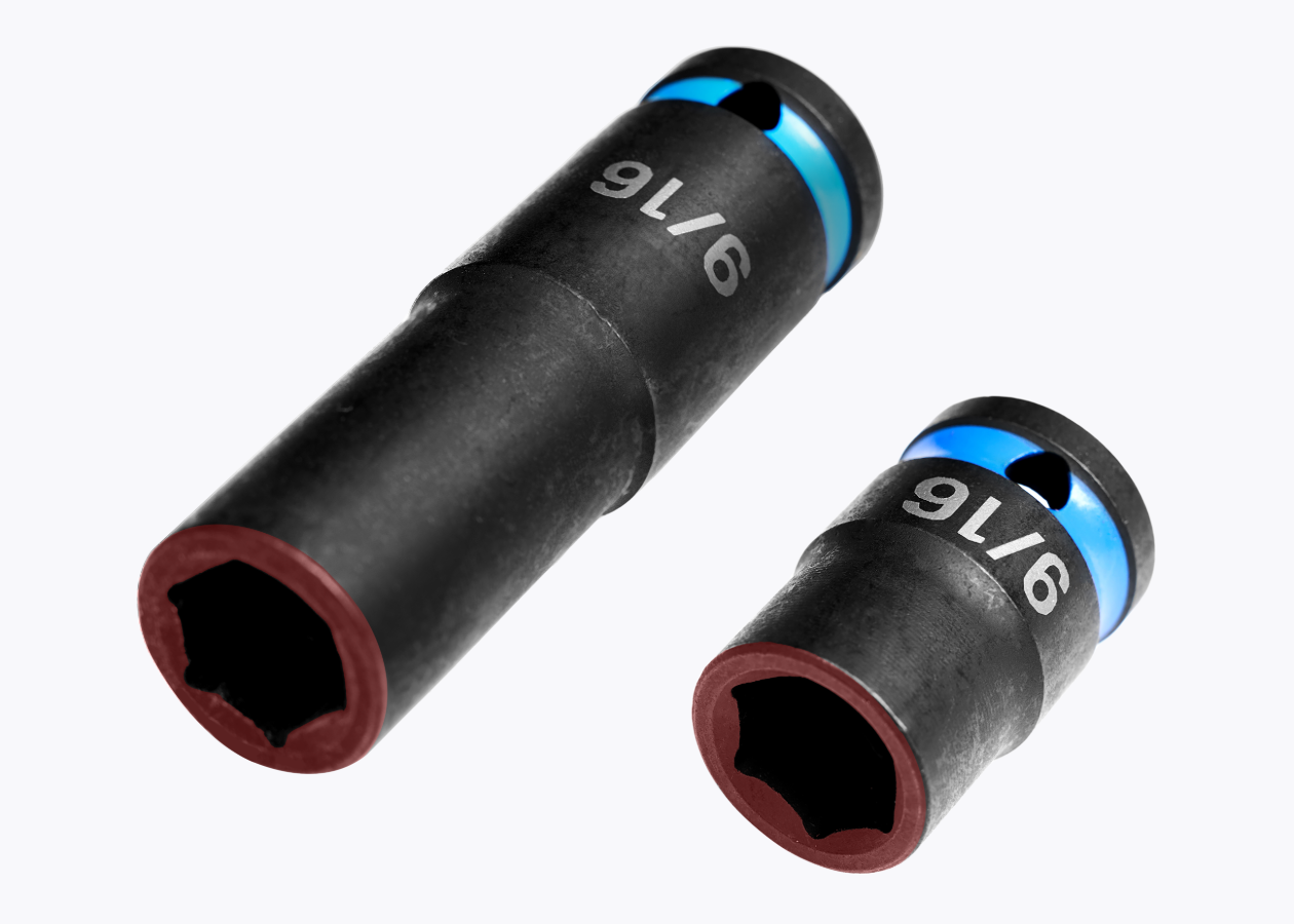 Each socket has a permanent, high-vis, laser-etched socket size, and various drive sizes are marked by different colors for quick and easy identification, even after heavy use. This allows technicians to work quickly and efficiently without wasting time searching for the correct size.