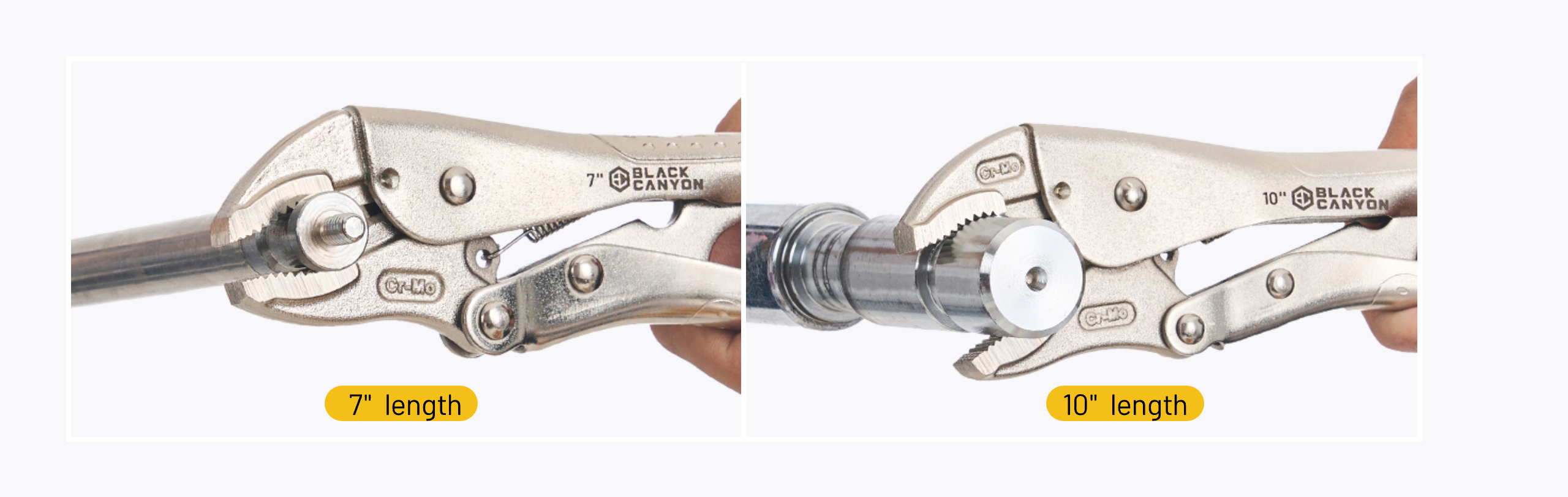 7" length with max. 1.5" jaw opening is suitable for tight working spaces.10" length with max. 1.9" jaw opening is suitable for gripping larger objects.