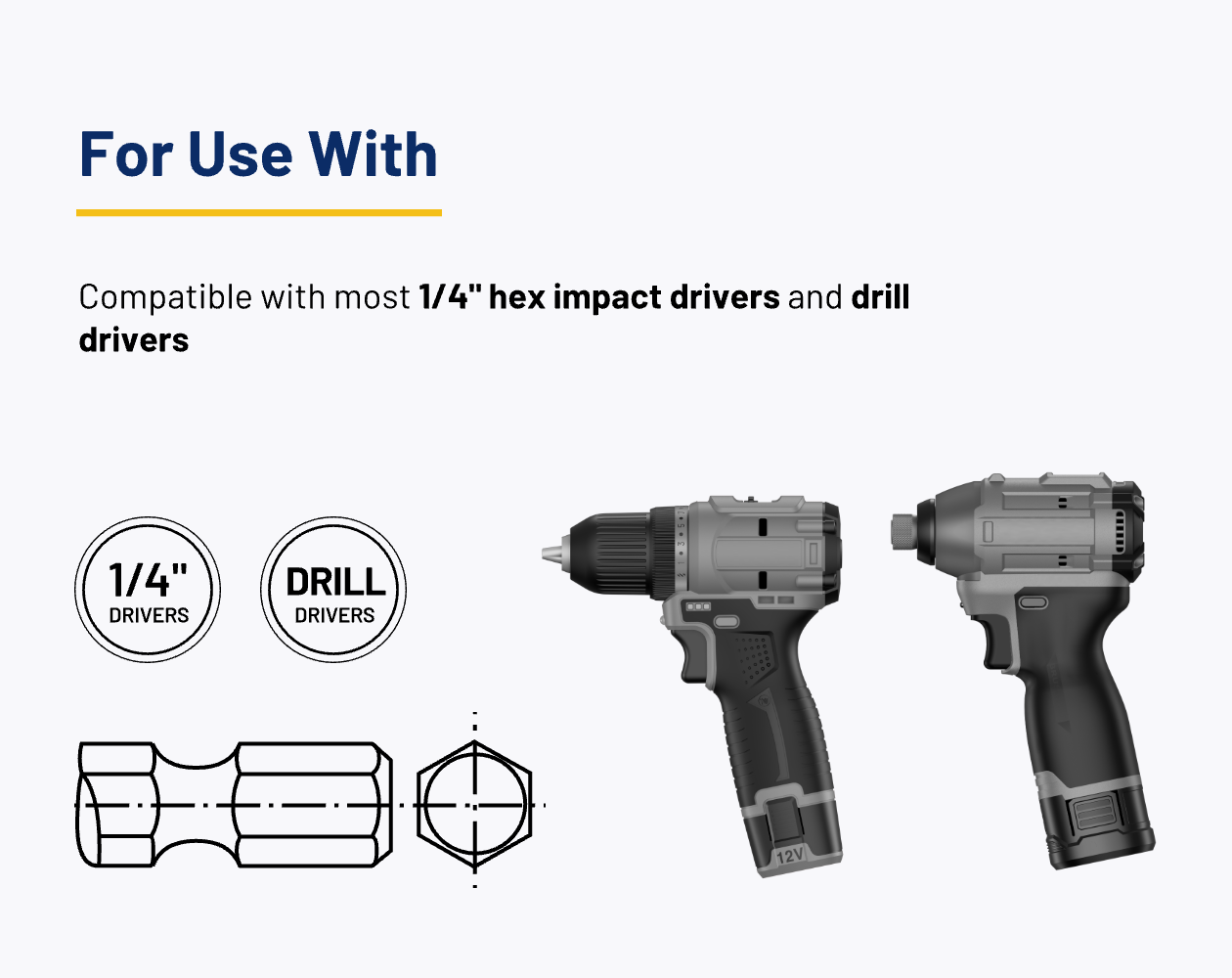 Compatible with most 1/4" hex impact drivers and drill drivers.