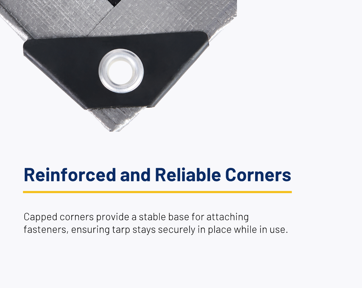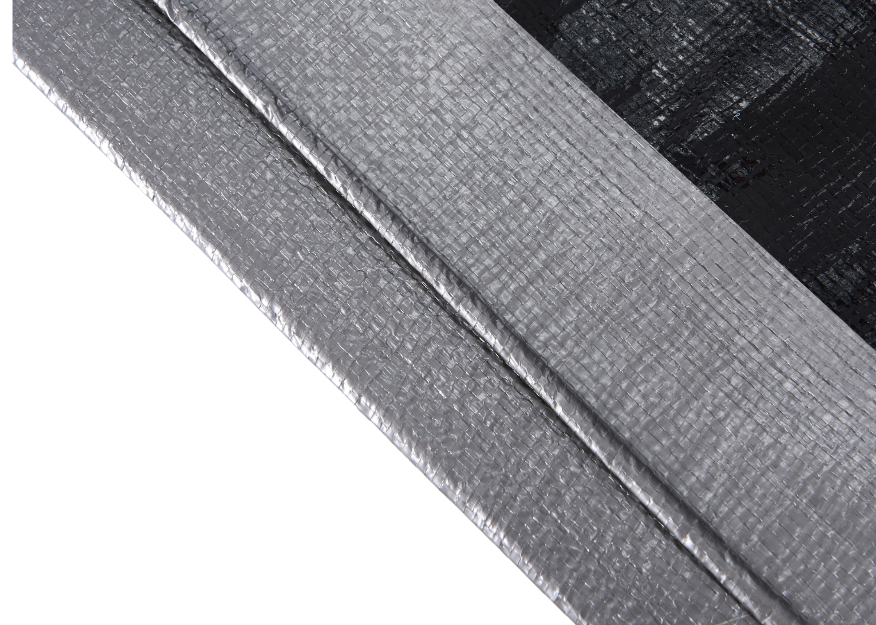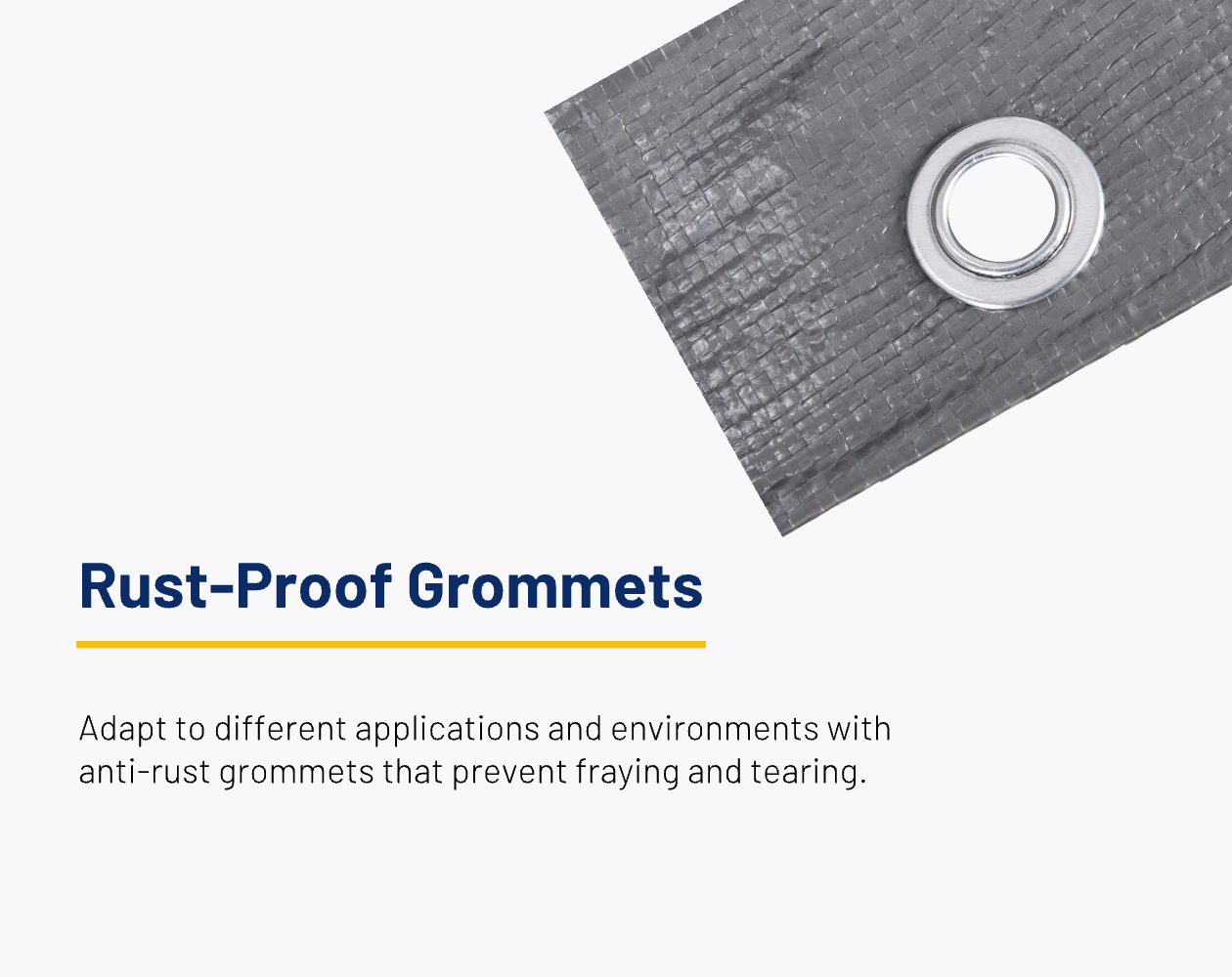 Woven and coated PE with heat-sealed seams is water, UV and tear resistant, ensuring tarp remains strong, durable and weatherproof, even under heavy usage and extreme conditions.