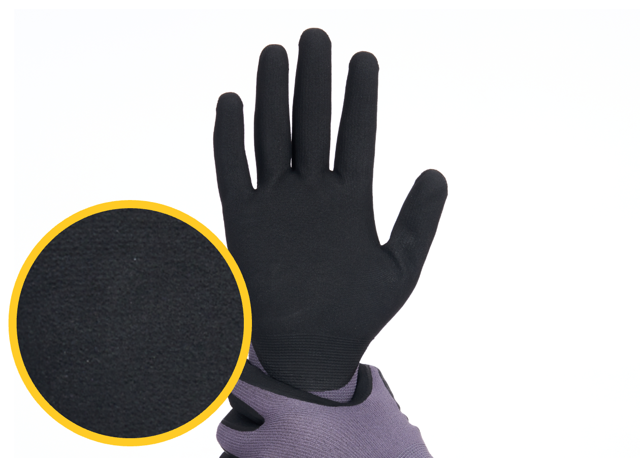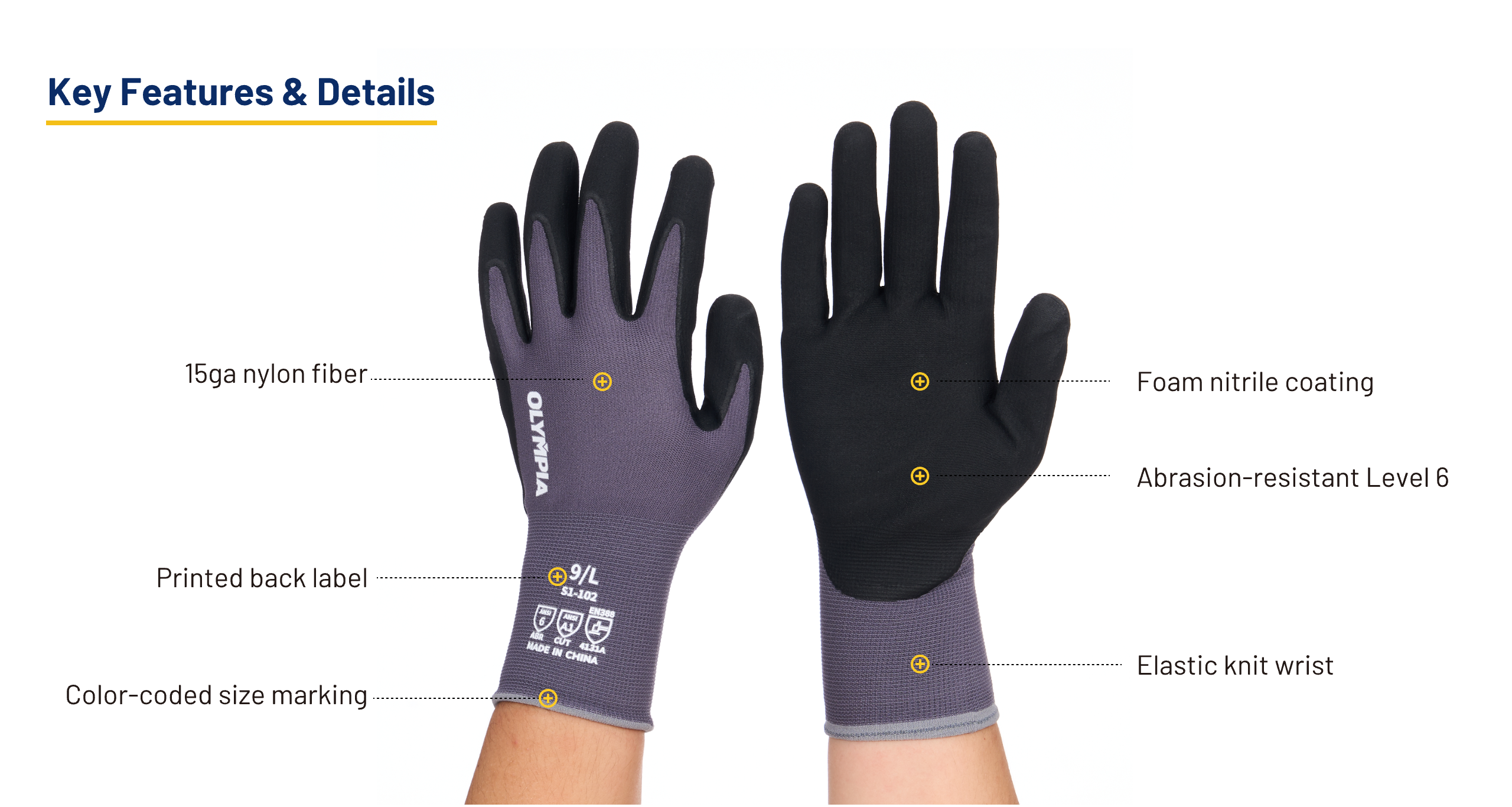 The palm-dipped foam nitrile coating is abrasion-resistant and provides a firm grip to prevent slipping, making it ideal for medium to heavy-duty use.