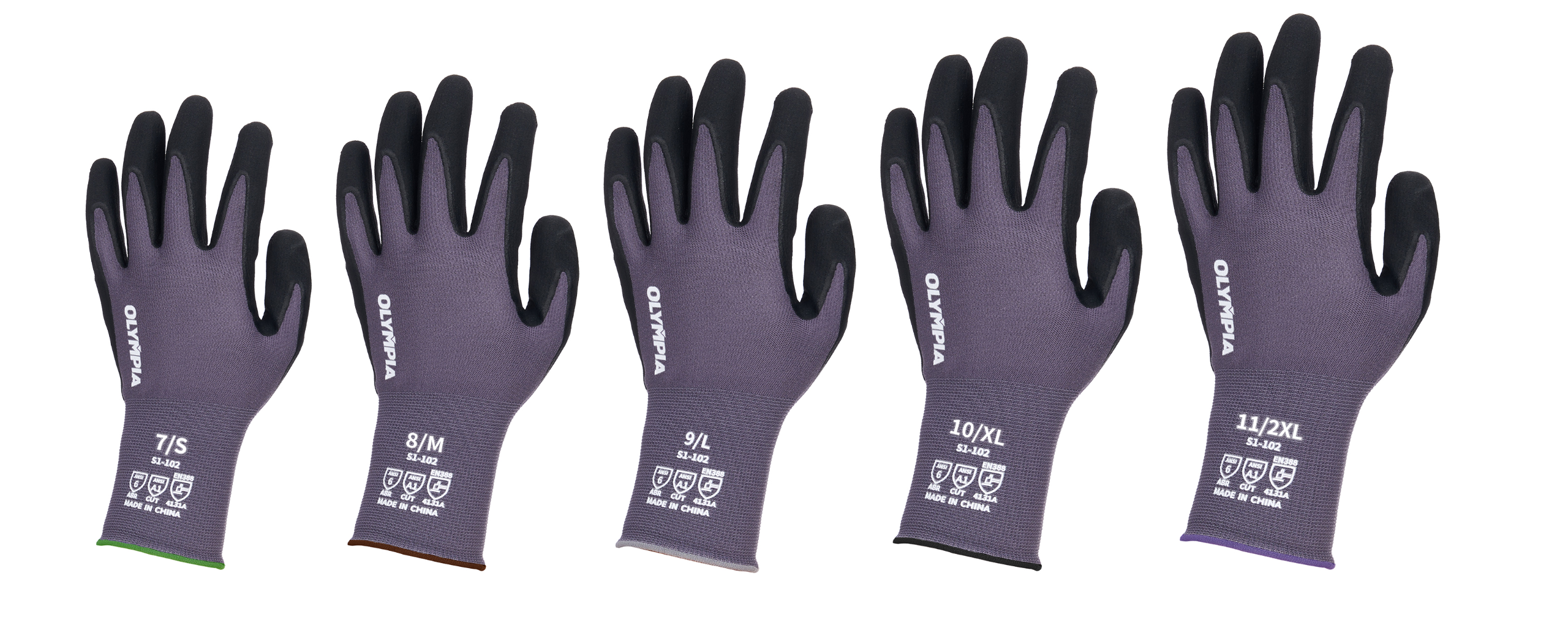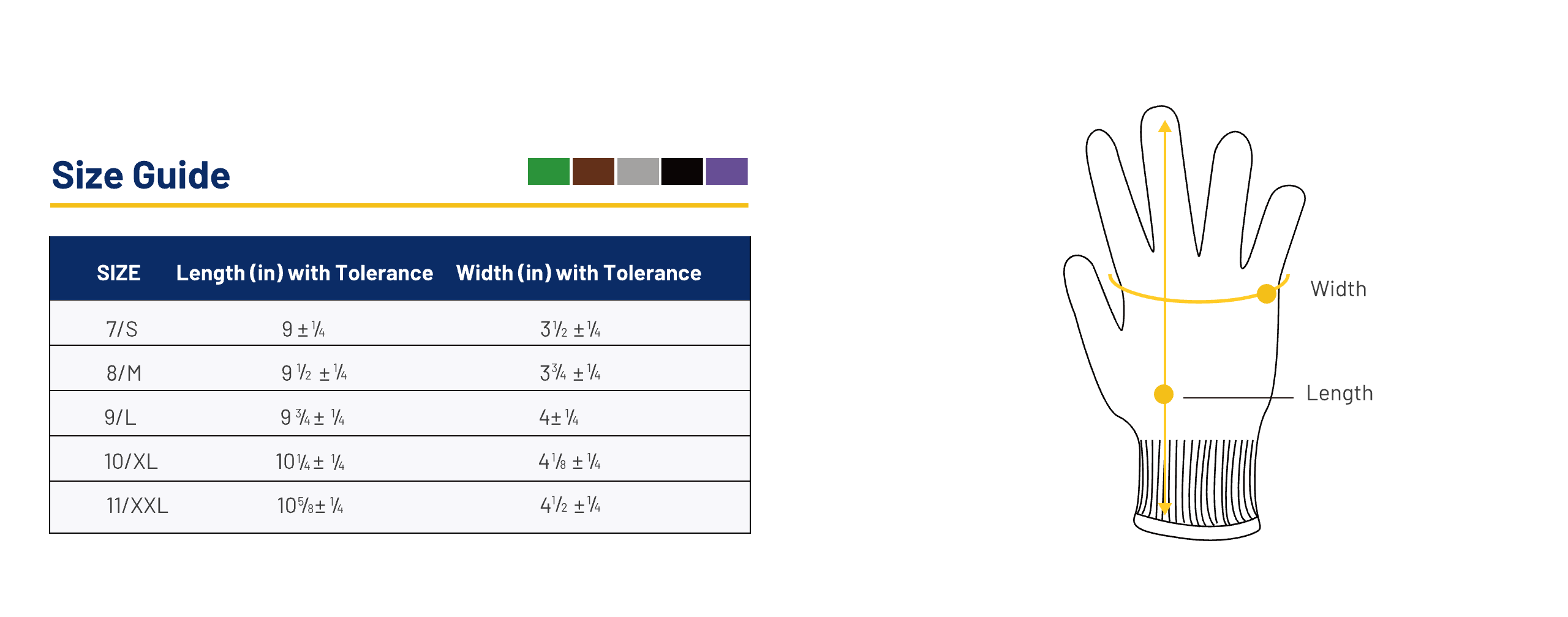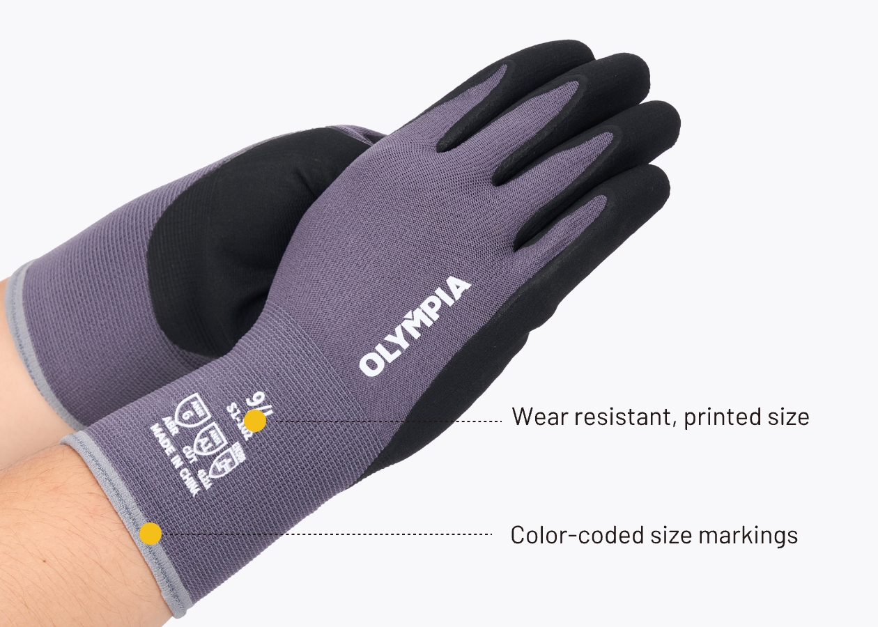 Wear resistant, printed size on the back remains clear and legible, even after heavy use. Serged edge color-coding is applied across all Olympia gloves, providing a clear and consistent visual for quick and easy size identification.