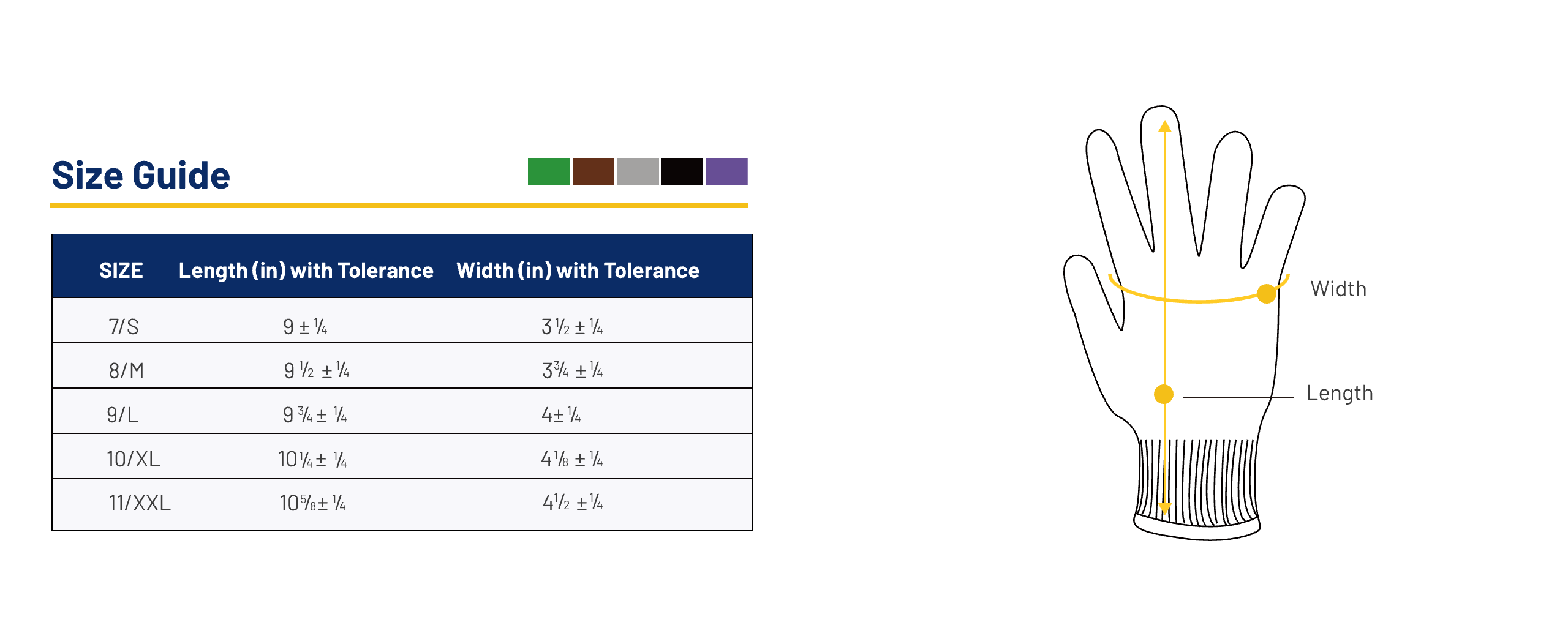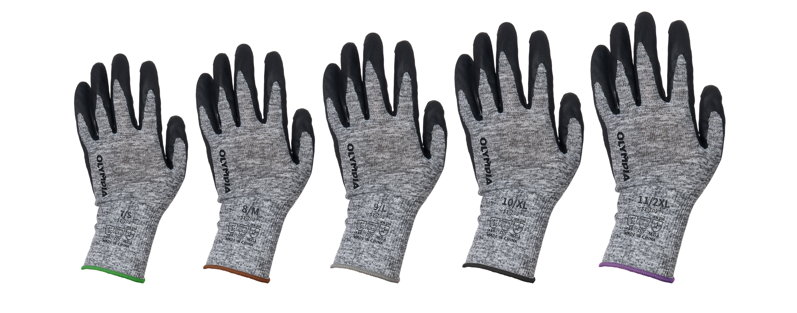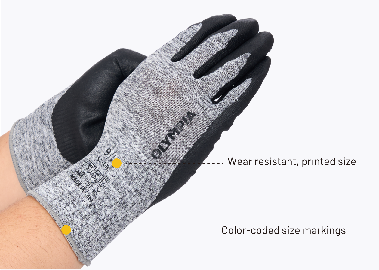Wear resistant, printed size on the back remains clear and legible, even after heavy use. Serged edge color-coding is applied across all Olympia gloves, providing a clear and consistent visual for quick and easy size identification.