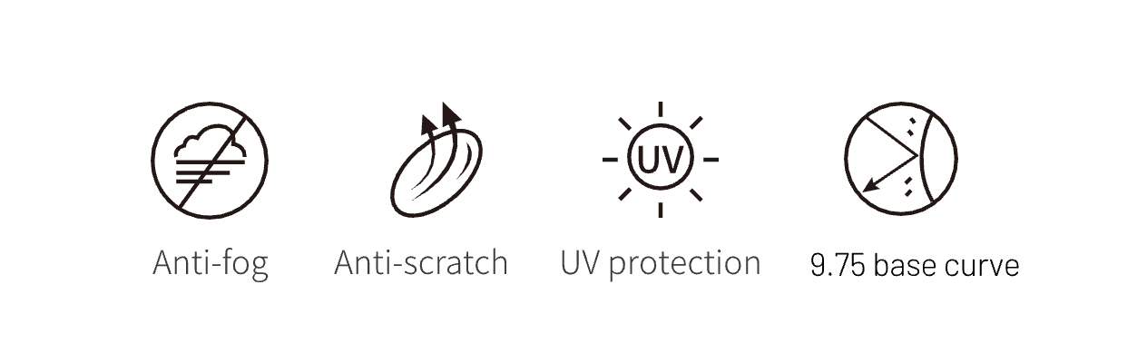 Made from polycarbonate, these glasses are coated for scratch and fog resistance and can filter out 99.9% of harmful UV light. One-piece lens with dual 9.75 base curve protects against minor abrasions caused by daily wear.