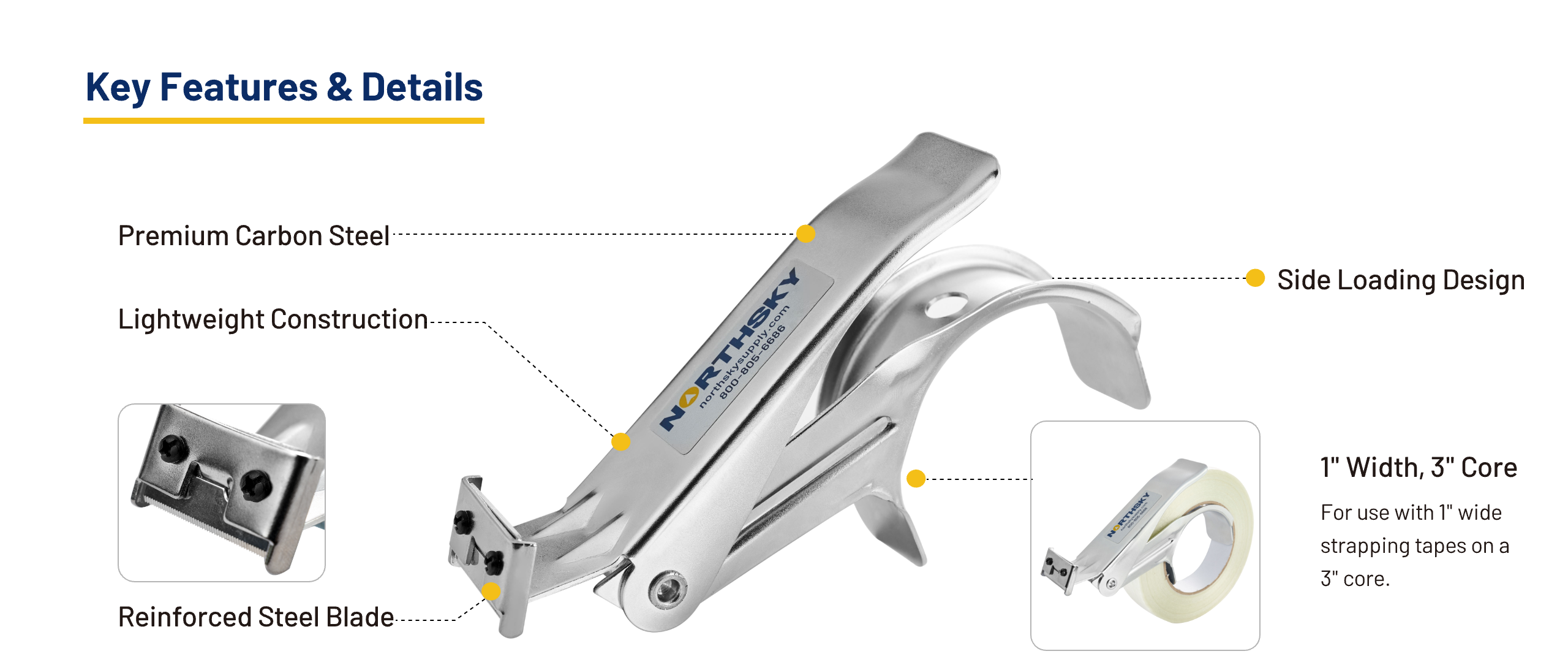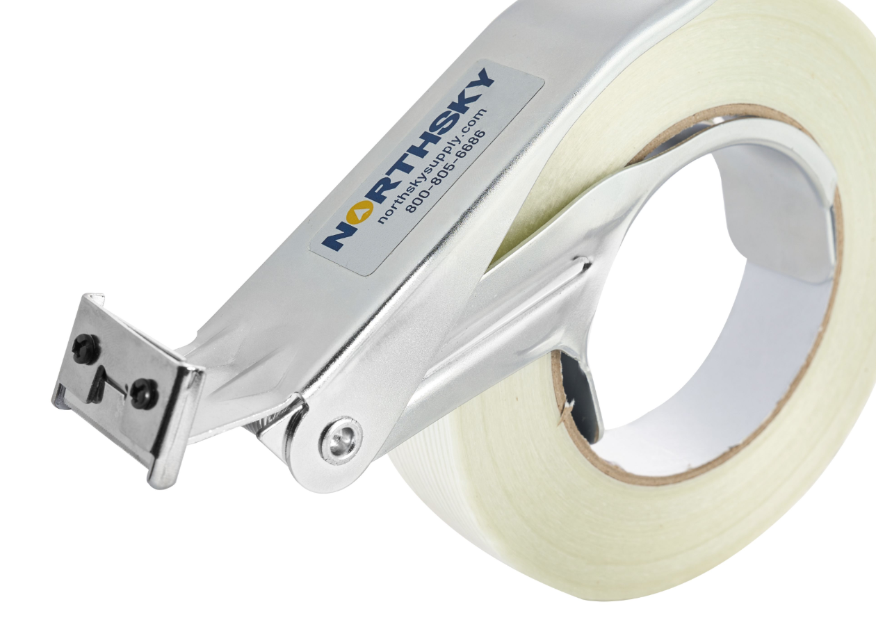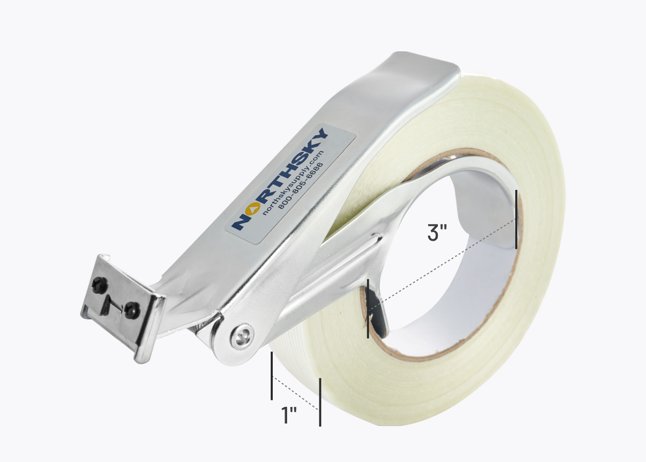 For use with 1" wide self-adhesive strapping tapes on a 3" core, this dispenser is compatible with NorthSky Select Strapping Tape P1-1020 and P1-1021.