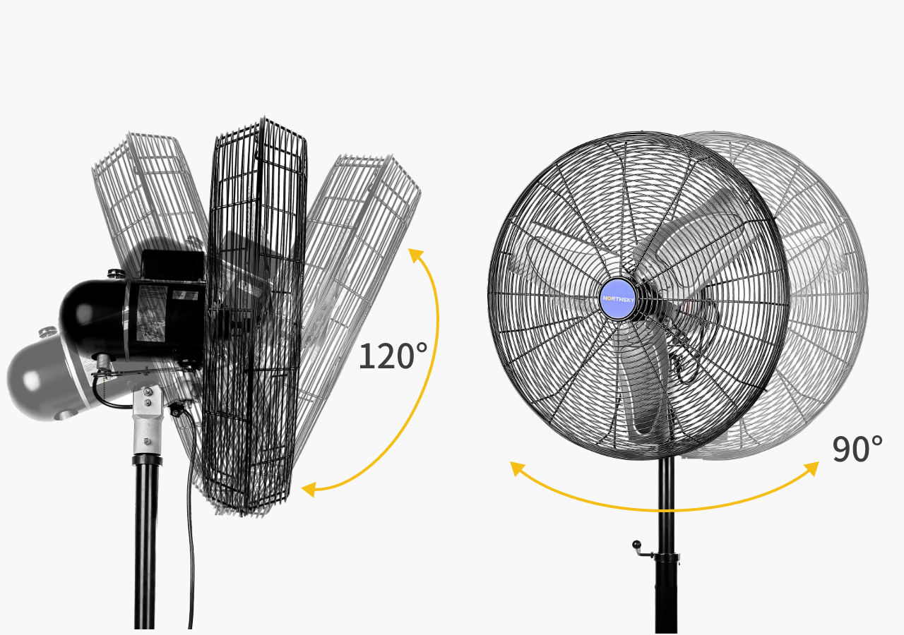 Features a 90° oscillation angle and 120° head tilt adjustment for broad air distribution and directional airflow control