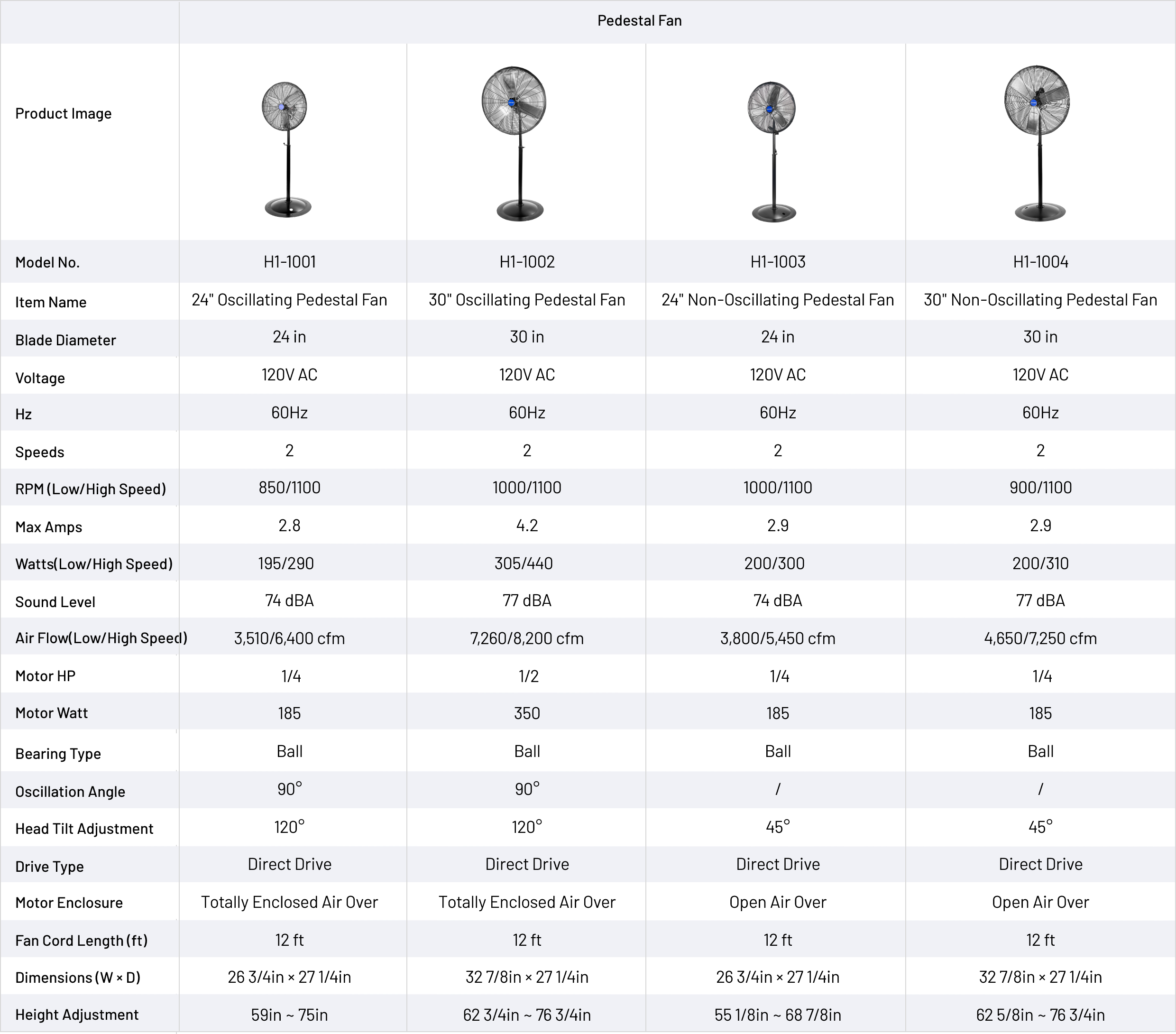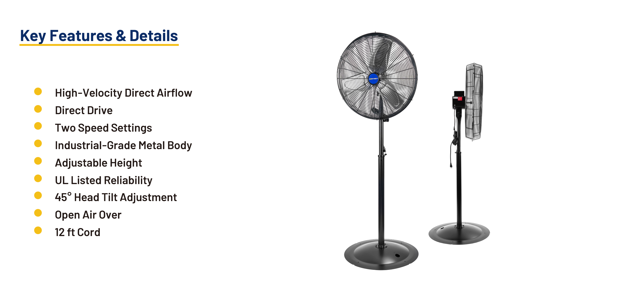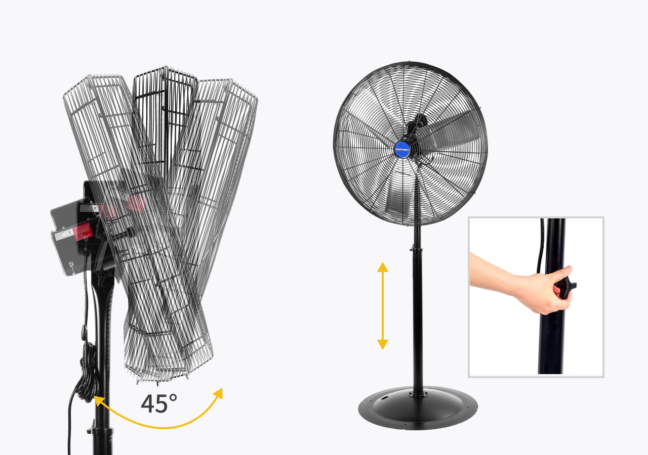 This pedestal fan meets recognized safety and performance standards for peace of mind in industrial and commercial use alike.