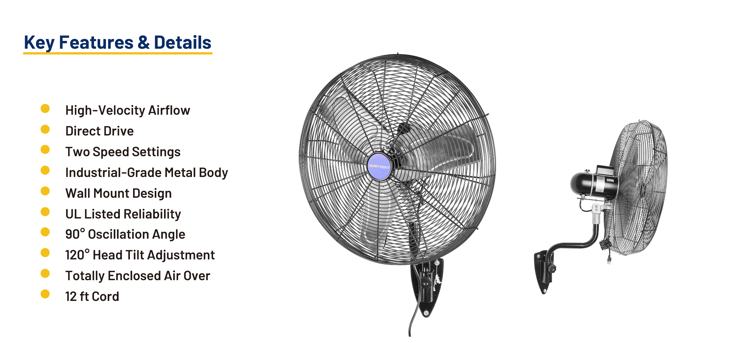 This wall mount oscillating fan delivers up to 8,200 CFM for fast and effective air circulation, with two speed settings offering flexible airflow control.