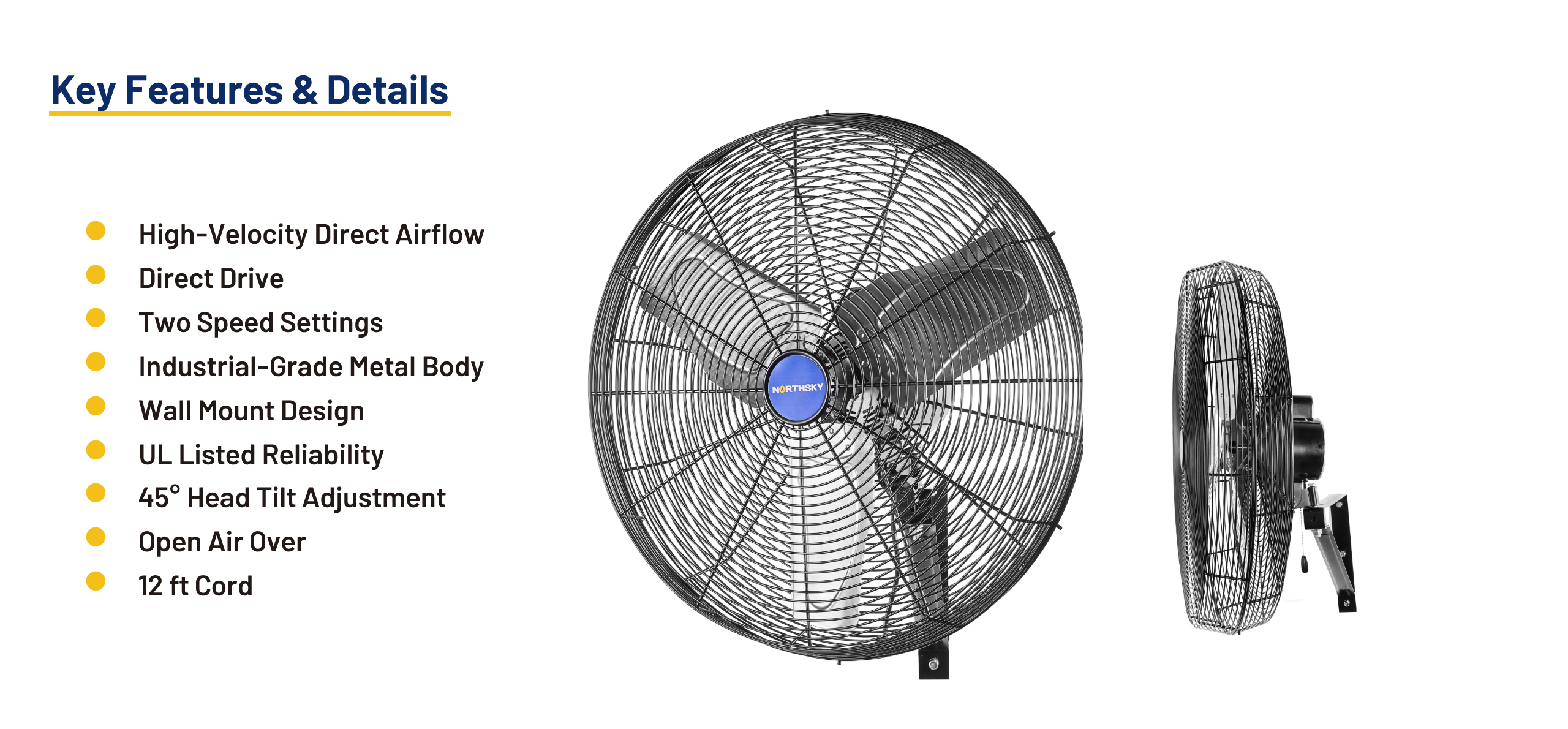 This wall mounted fan meets recognized safety and performance standards for peace of mind in industrial and commercial use alike.