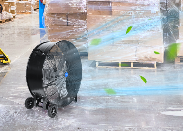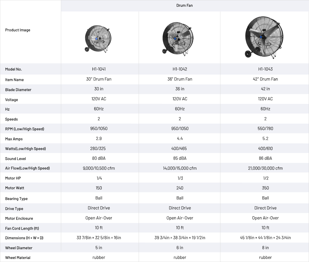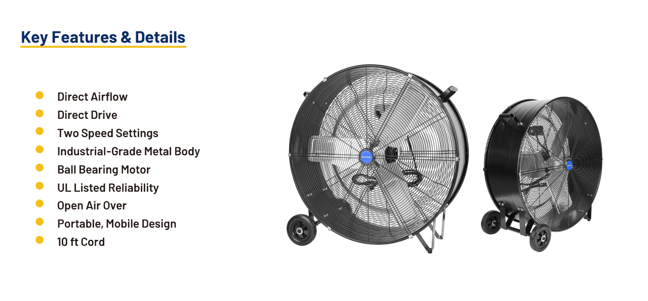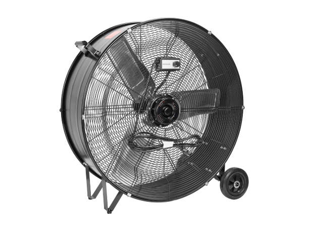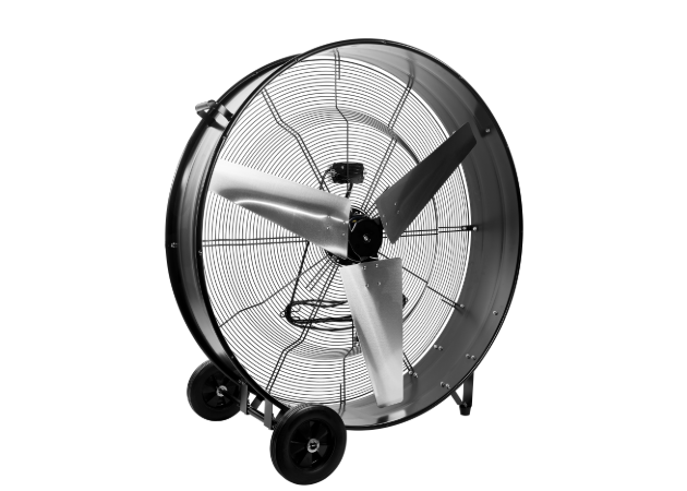 This heavy-duty industrial drum fan features a durable all-metal body, aluminum fan blades, reinforced steel housings and a ball bearing motor for long-term reliability in demanding environments.