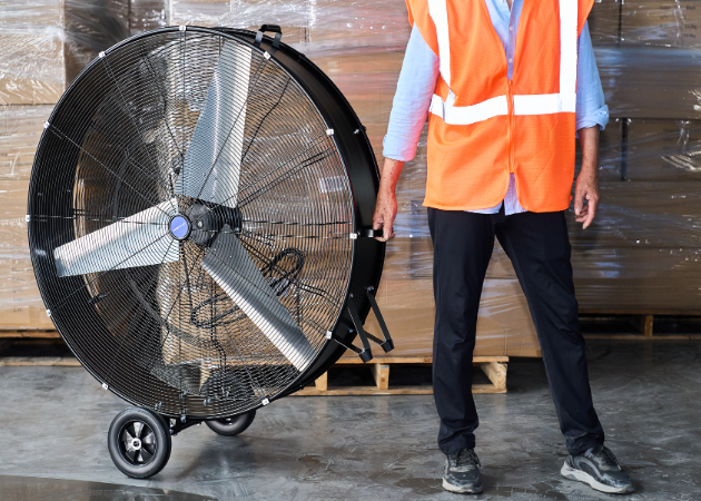 Heavy-duty rubber wheels (5" - 8" depending on model) make transporting this fan across large spaces easy and efficient.