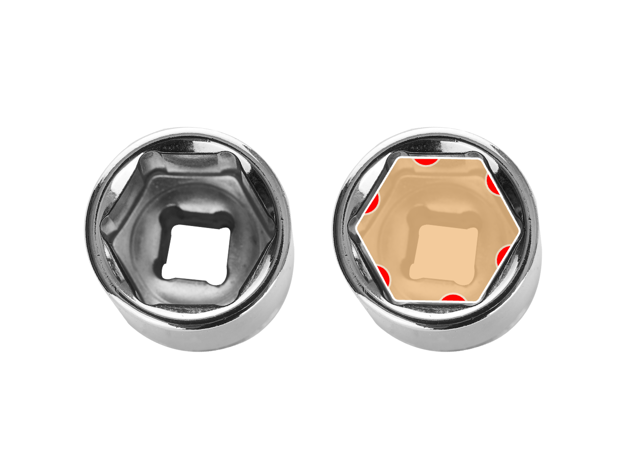 The 6-point hexagonal socket design ensures maximum contact with fasteners, and the chamfered opening allows for easy insertion. Radiused corners prevent fastener round-off by applying force to the fastener's flat sides, rather than its corners.