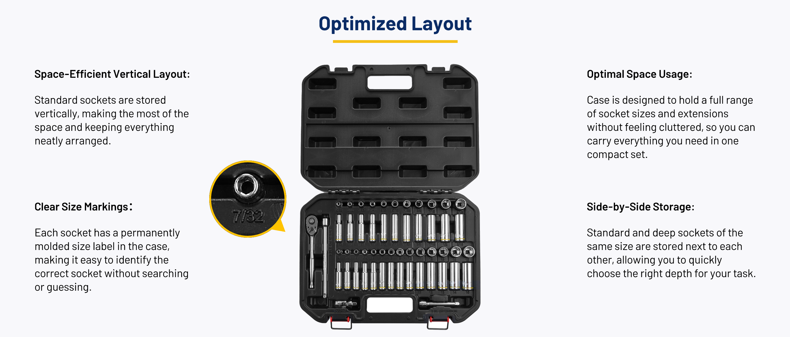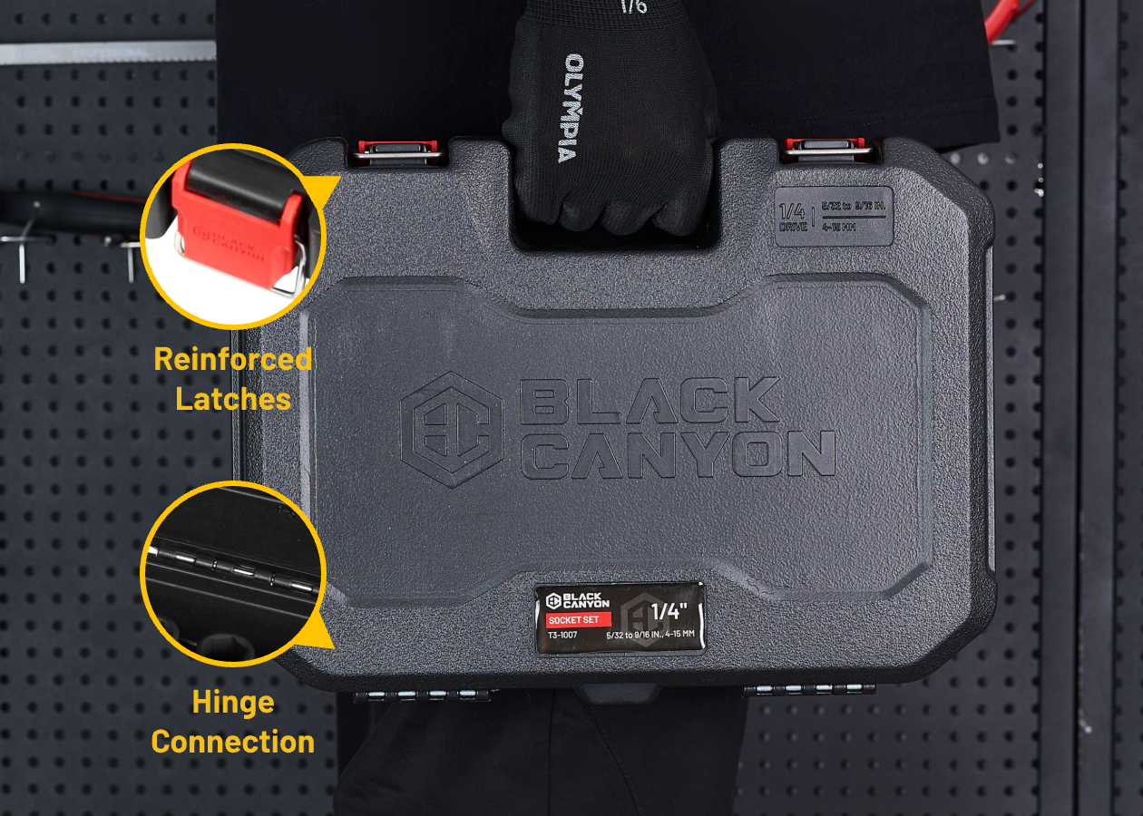 This high-quality, impact-resistant case with portable handle and reinforced latches and hinge connection is great for stacking,storing and transporting. It keeps sockets securely in place and prevents loosening or misalignment, even after prolonged use or extensive transport.