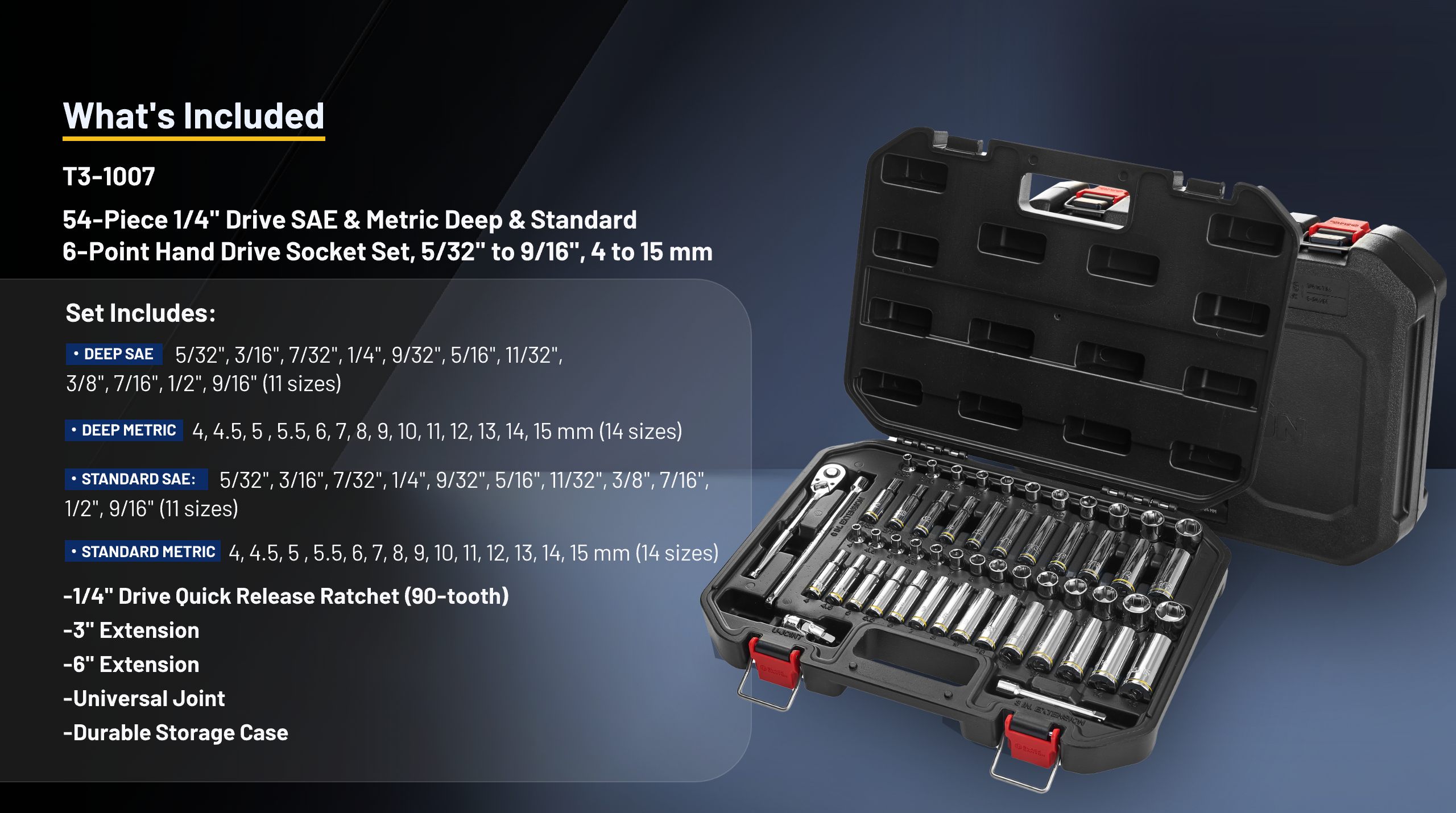 This comprehensive 54-piece socket set combines both deep and standard 6-point sockets in full SAE (5/32"–9/16") and metric (4–15 mm) size ranges. It comes complete with extensions, a universal joint and a 90-tooth ratchet, offering all-in-one functionality for precision work across a wide range of applications.