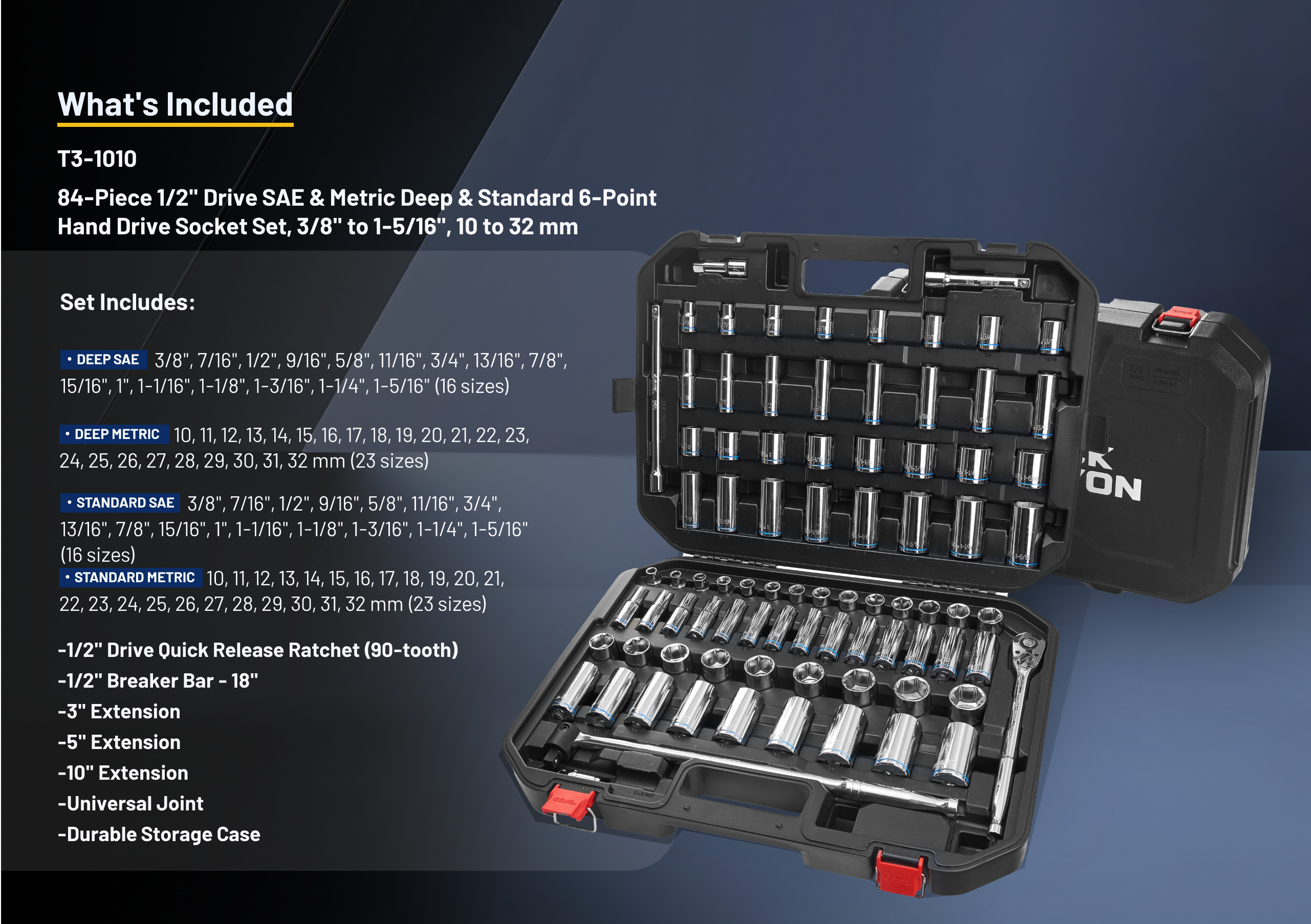 With 84 pieces covering a complete SAE (3/8"–1-5/16") and metric (10–32 mm) size range in both deep and standard 6-point designs, this socket set is built for heavy-duty versatility and includes a 90-tooth ratchet, multiple extensions, a breaker bar and a universal joint, all housed in a durable storage case for reliable and lasting performance.