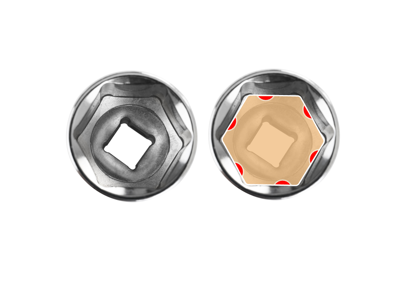 The 6-point hexagonal socket design ensures maximum contact with fasteners, and the chamfered opening allows for easy insertion. Radiused corners prevent fastener round-off by applying force to the fastener's flat sides, rather than its corners.
