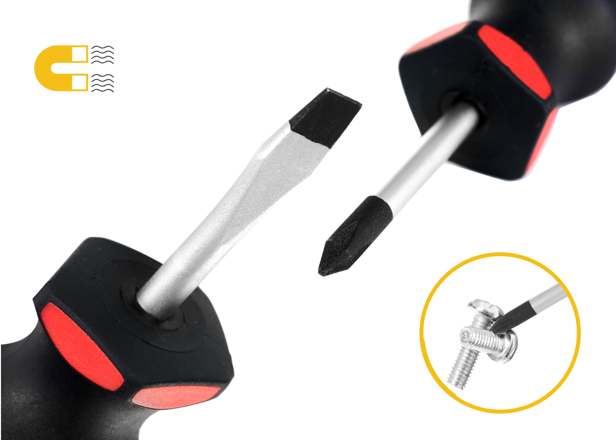 Available in Slotted tips (3/16", 1/4") and Phillips tips (#1, #2), ensuring proper fit and reducing cam-out for common household and industrial fasteners.