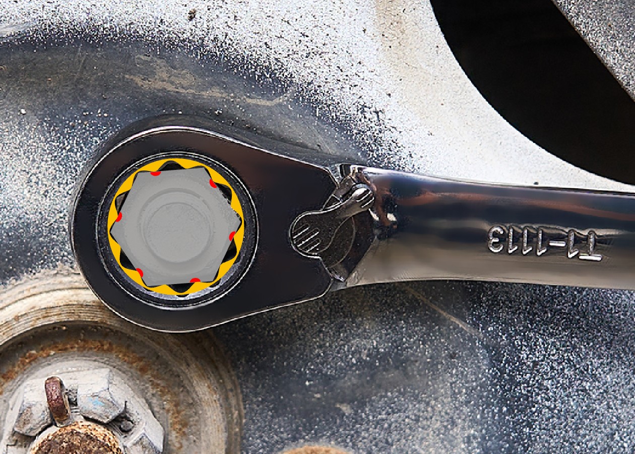 The precision forged 12-point box end features off-corner loading and grips the flat sides of fastener heads instead of corners, minimizing slippage and effectively preventing round-off.