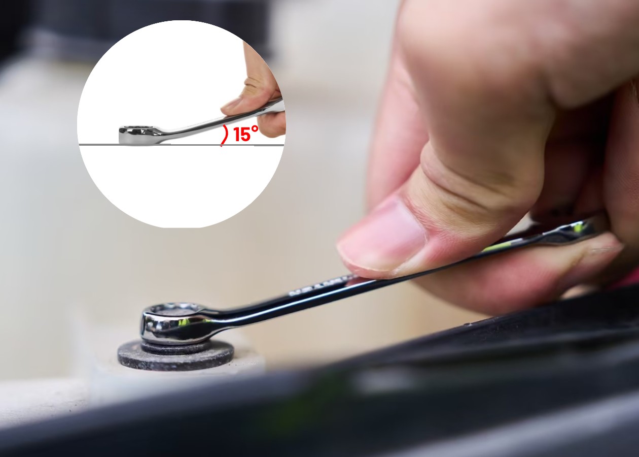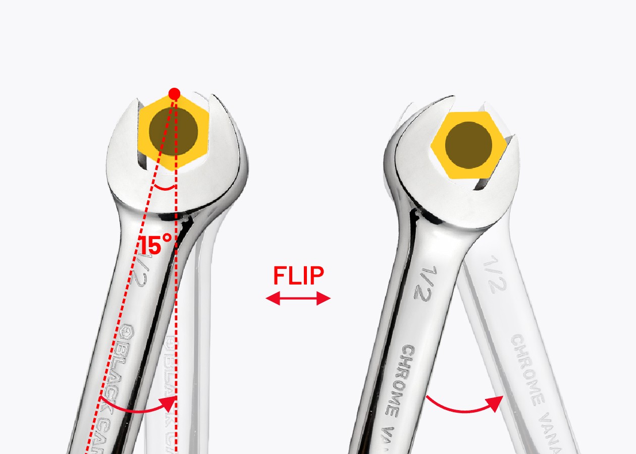This angle reduces the working swing arc, allowing the wrench to be flipped after each turn to engage the fastener twice as often—making fastening more efficient. It also provides a more secure grip on fasteners, reducing the risk of rounding edges and ensuring a reliable fit with every use.