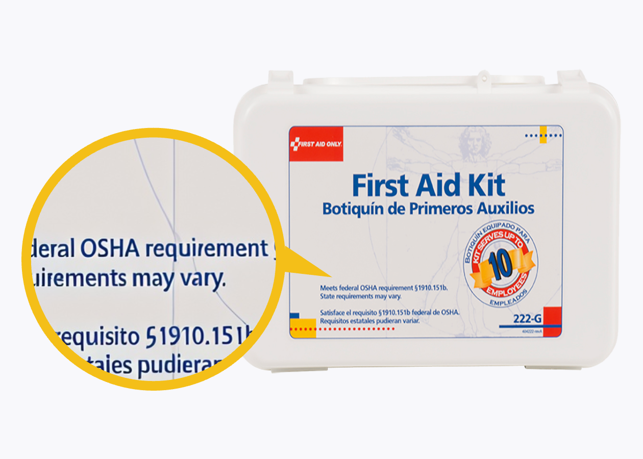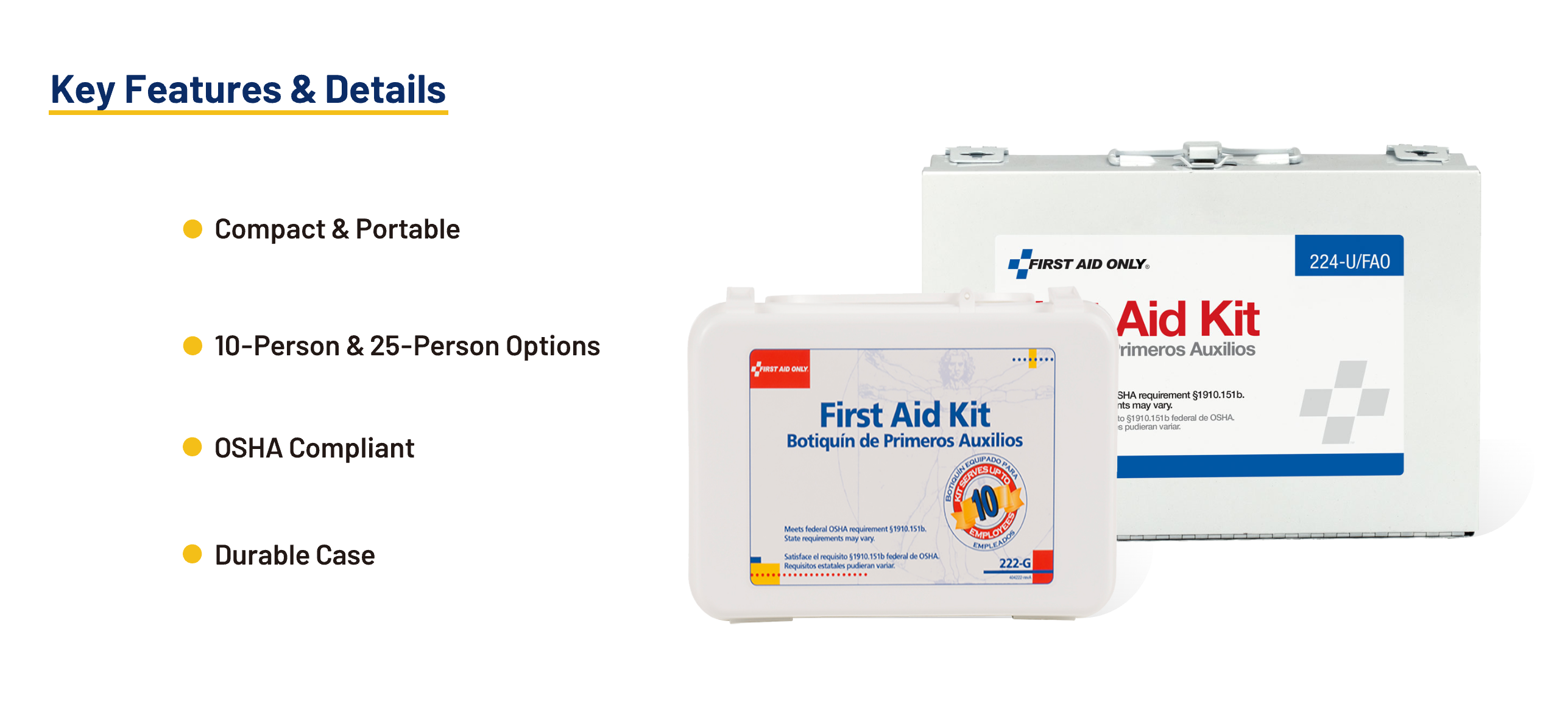 This OSHA compliant first aid kit meets federal 1910.151(b) standards.