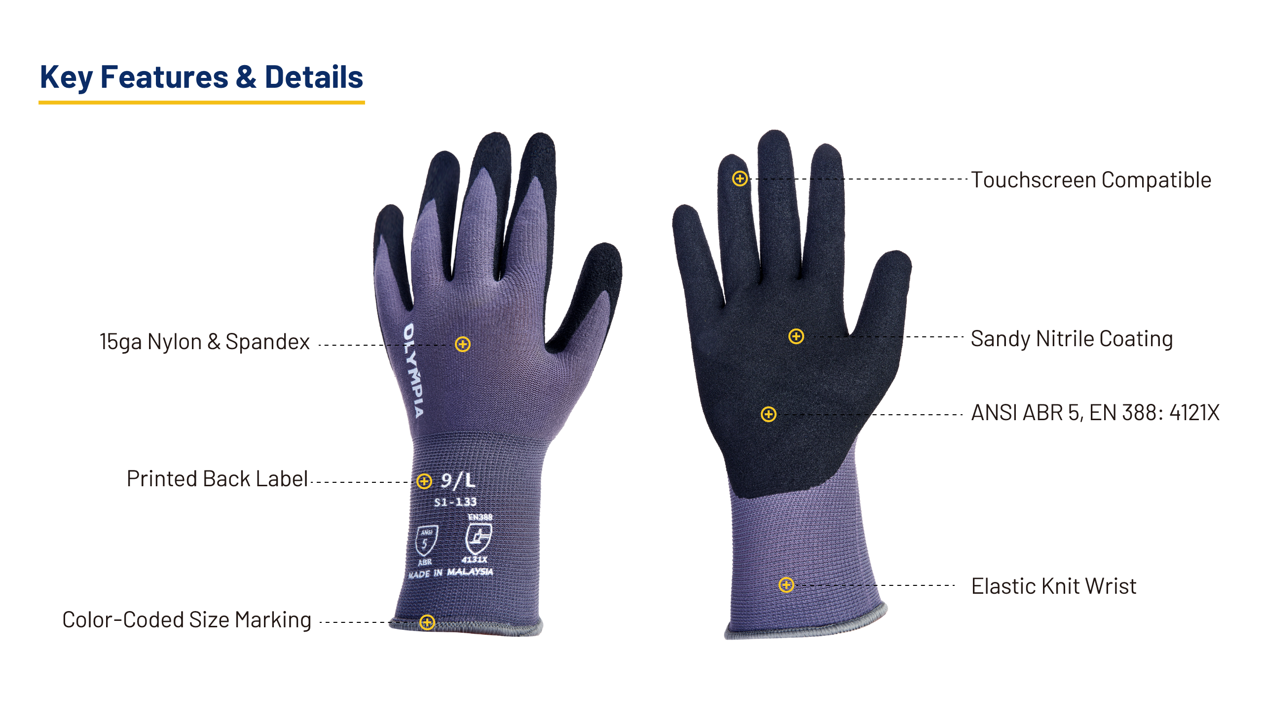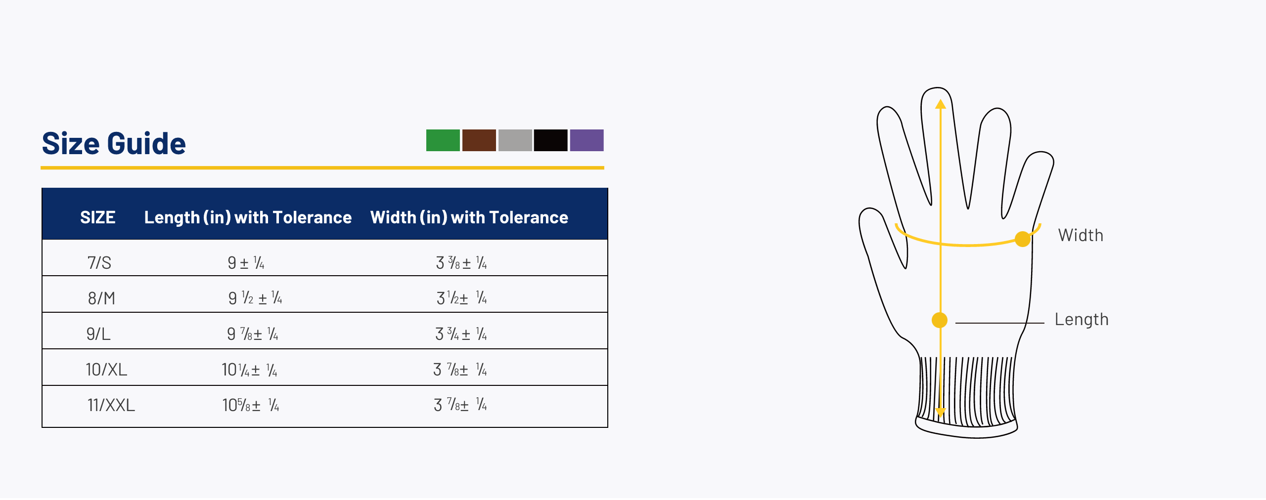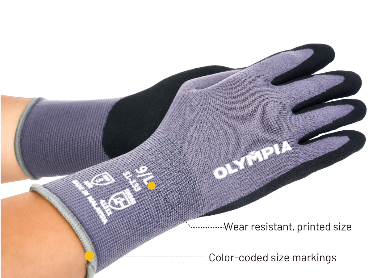 Wear-resistant, printed size on the back remains clear and legible, even after heavy usage. Serged edge color-coding is applied across all Olympia gloves, providing a clear and consistent visual for quick and easy size identification.