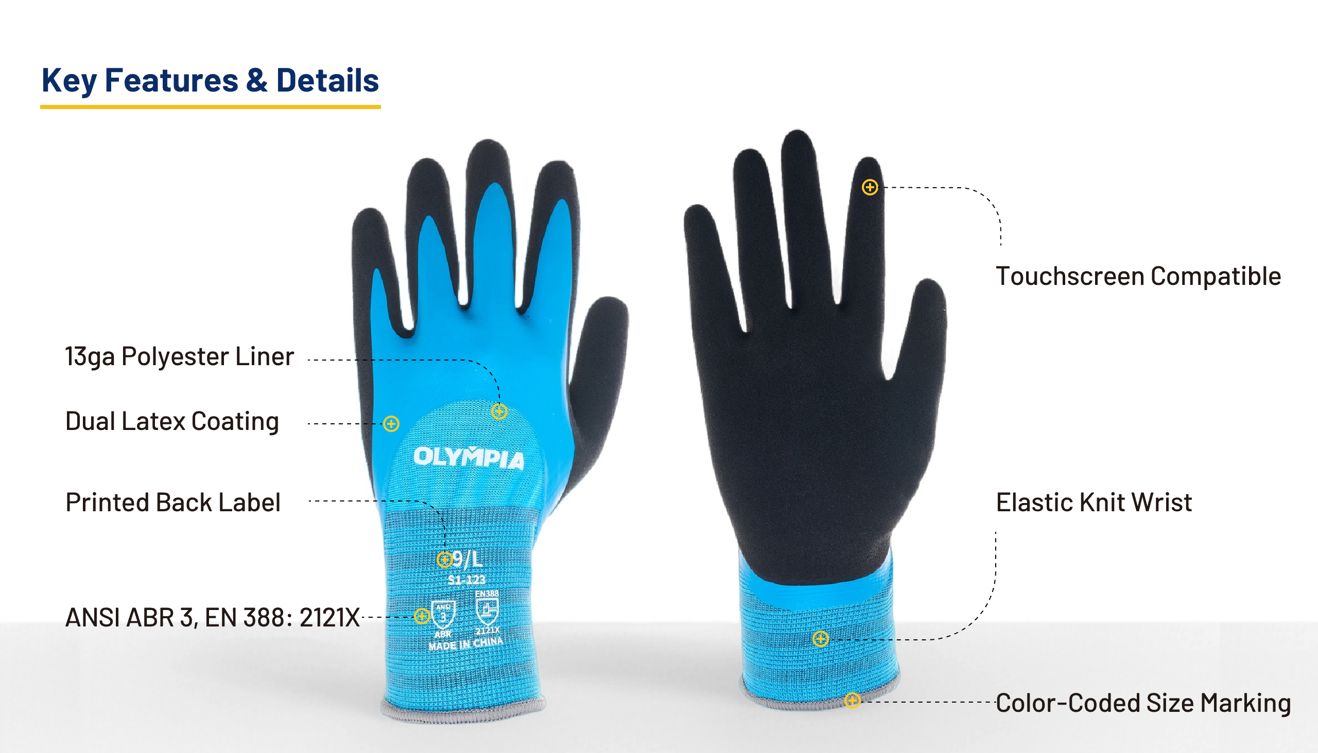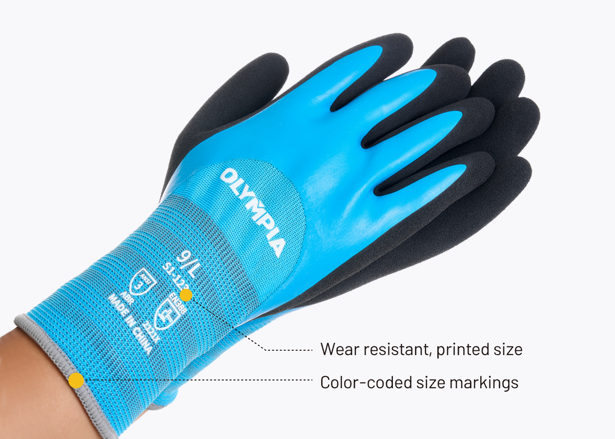 Wear-resistant, printed size on the back remains clear and legible, even after heavy usage. Serged edge color-coding is applied across all Olympia gloves, providing a clear and consistent visual for quick and easy size identification.