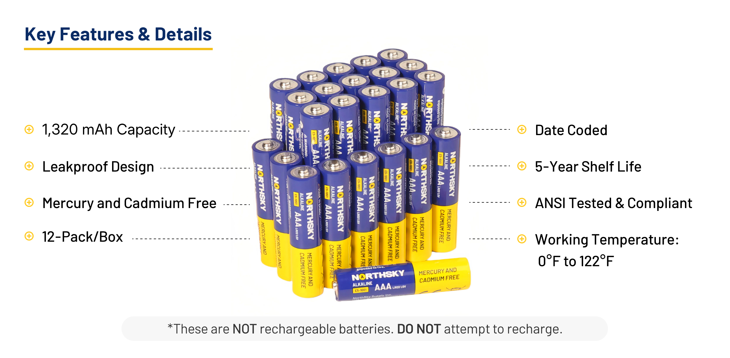 Alkaline batteries deliver up to 9x longer life than conventional carbon batteries, and provide consistent and reliable power with a battery capacity of 1,320 mAh.
