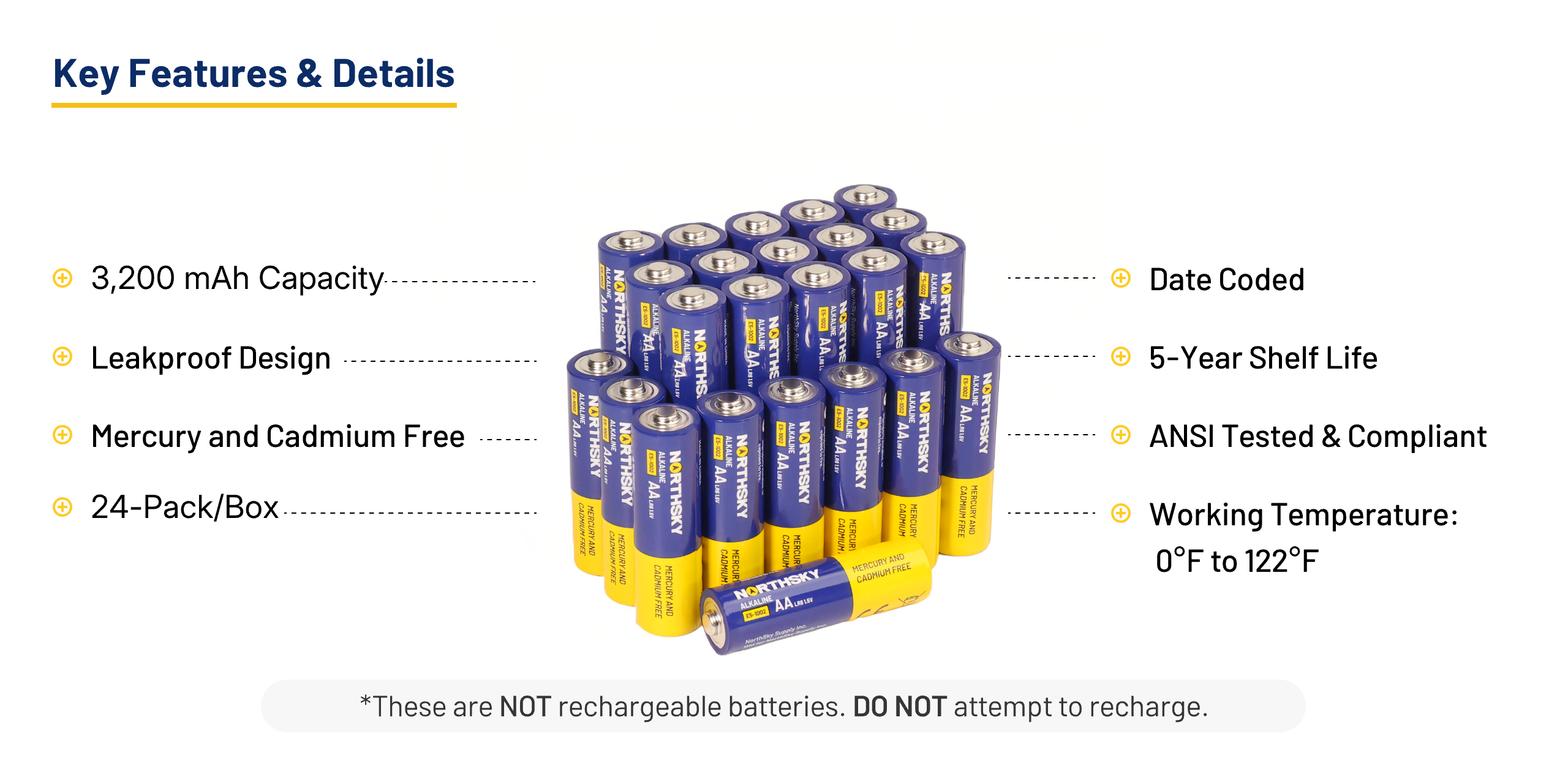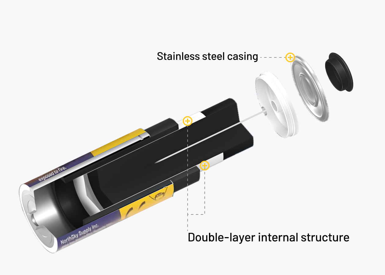Built with a double-layer internal structure and stainless steel casing, these batteries are leakproof, safeguarding your devices during use and storage.