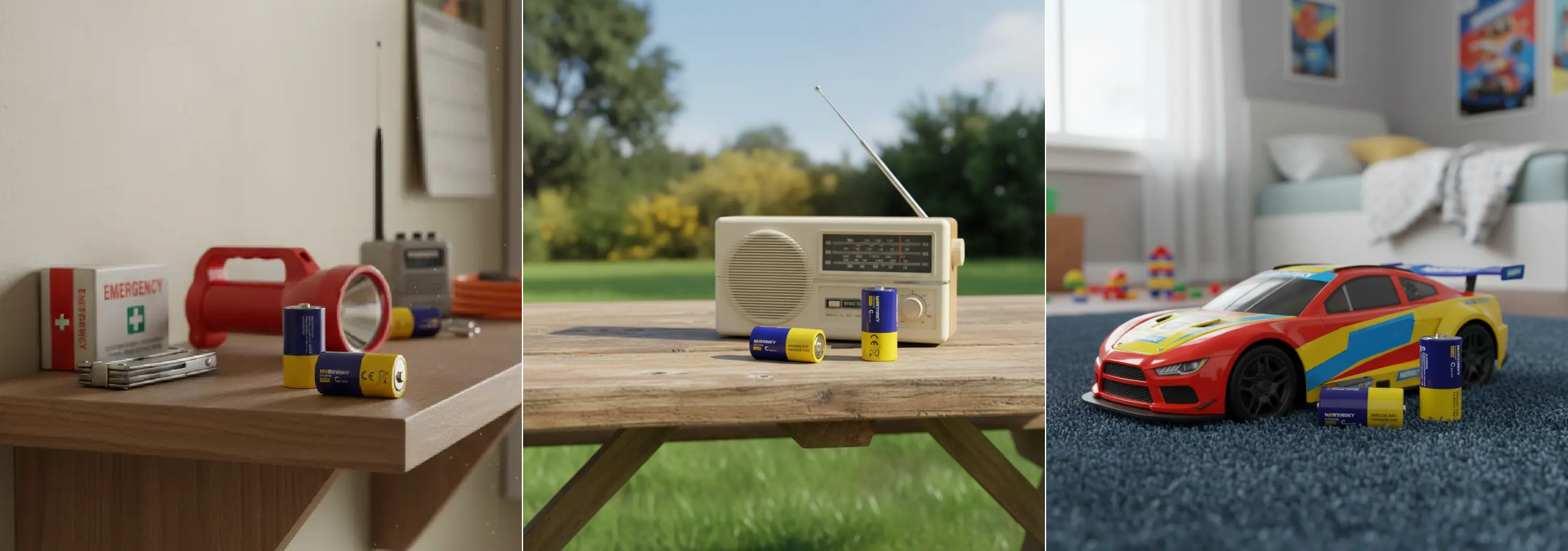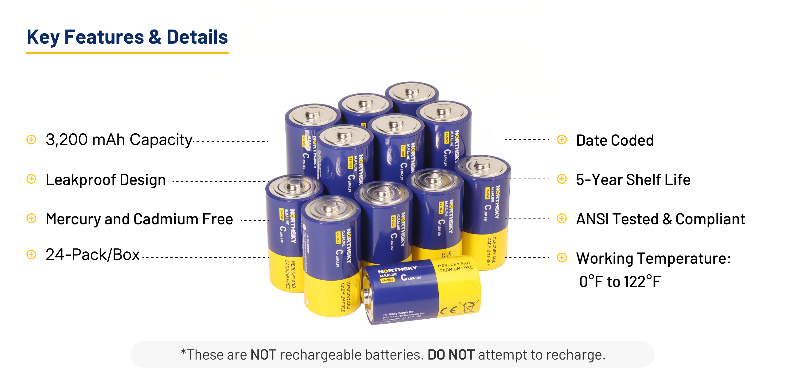 Perfect for mid to high-power use—outdoor flashlights, motorized toys, radios, monitors, emergency equipment, and more.