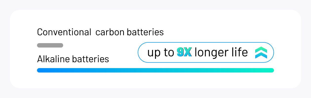 Alkaline batteries deliver up to 9x longer life than conventional carbon batteries. With a high 8,000 mAh capacity, these batteries deliver consistent, dependable performance—perfect for powering mid to high-drain devices over extended periods.