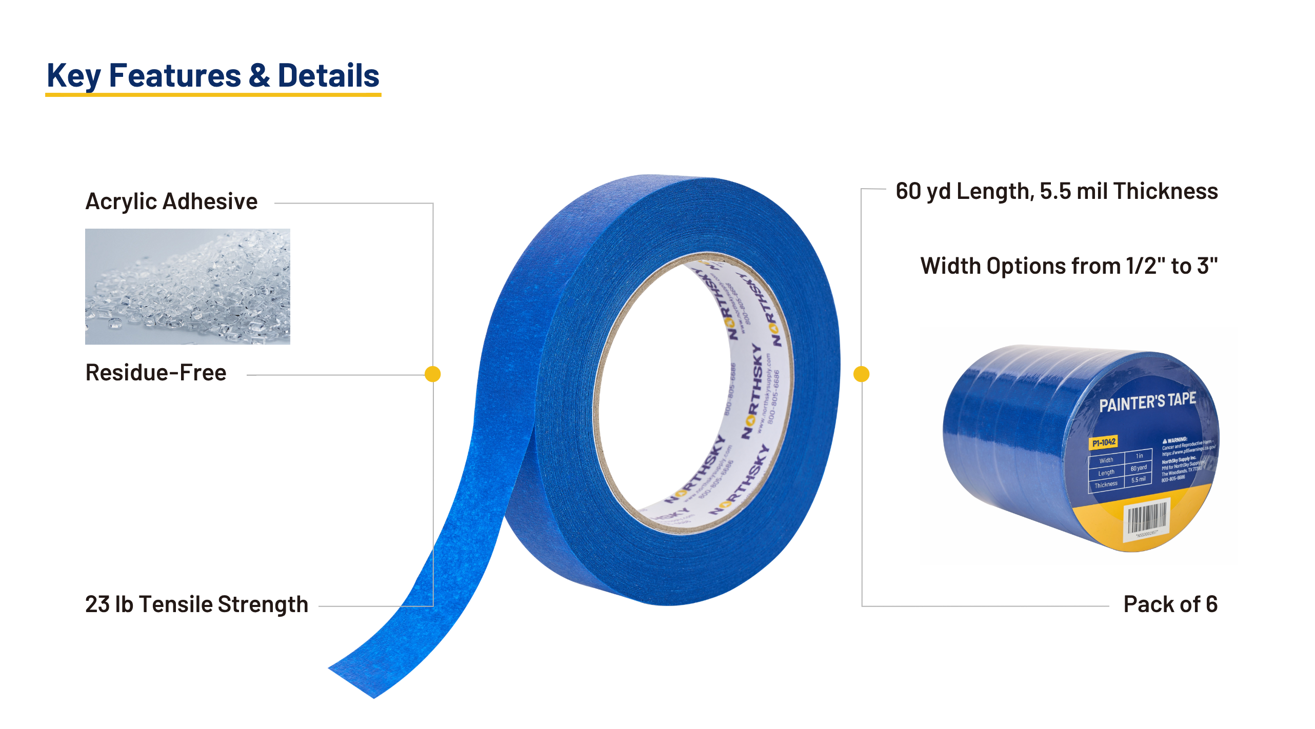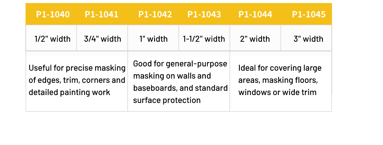 This painter's tape is available in widths from 1/2" to 3", suitable for precise masking or large surface coverage.
