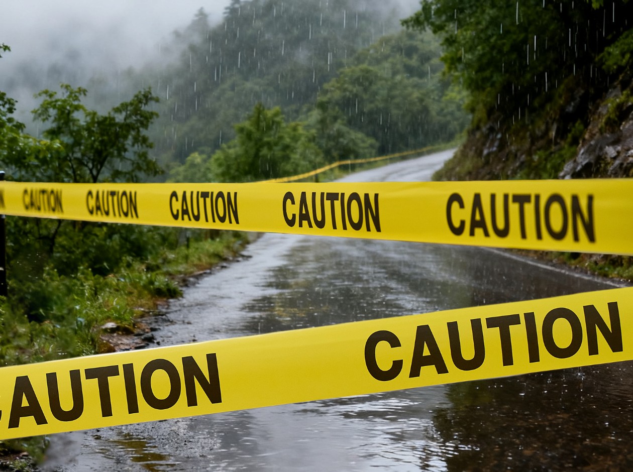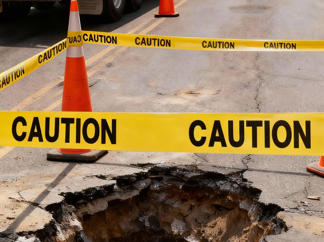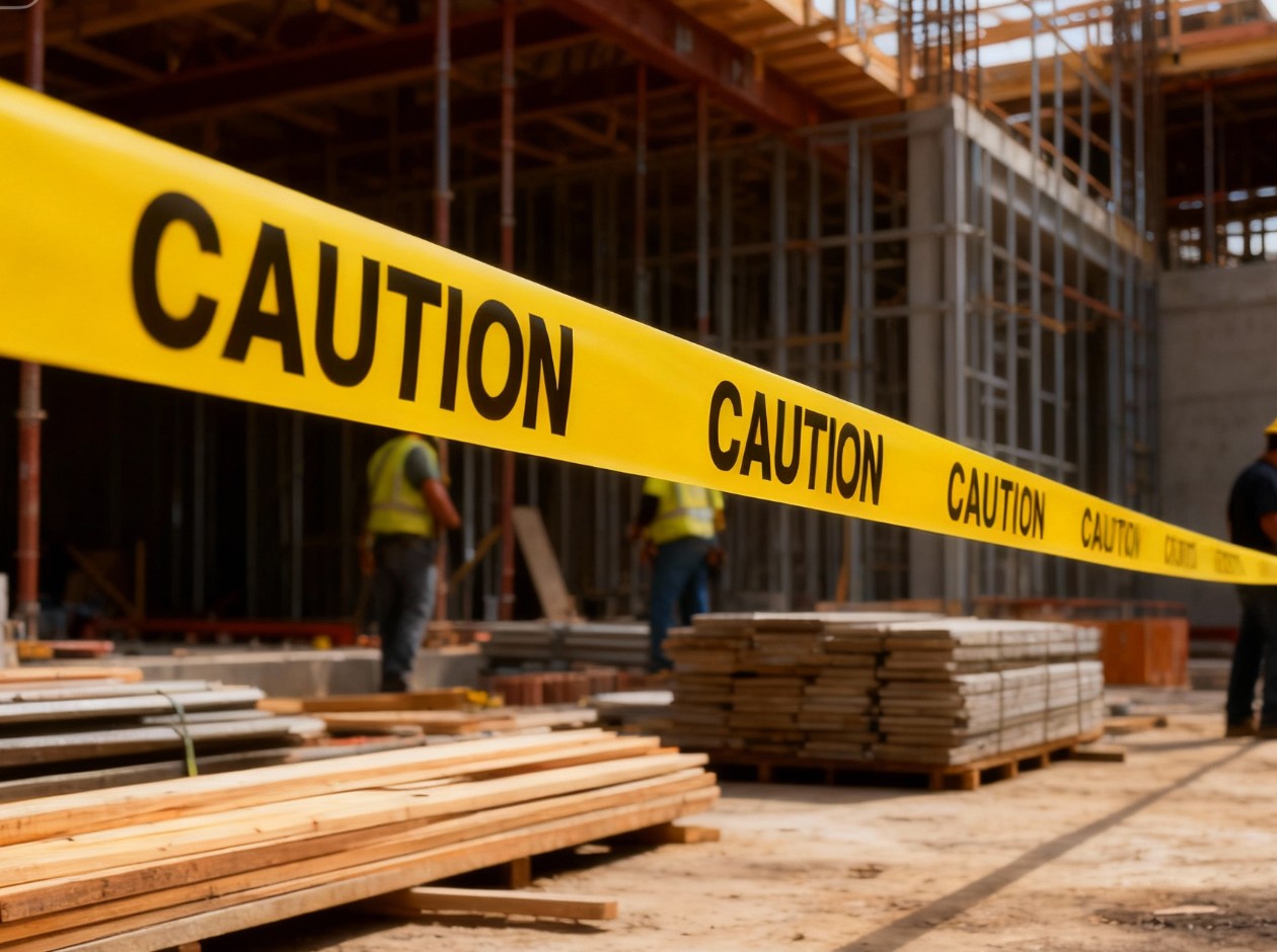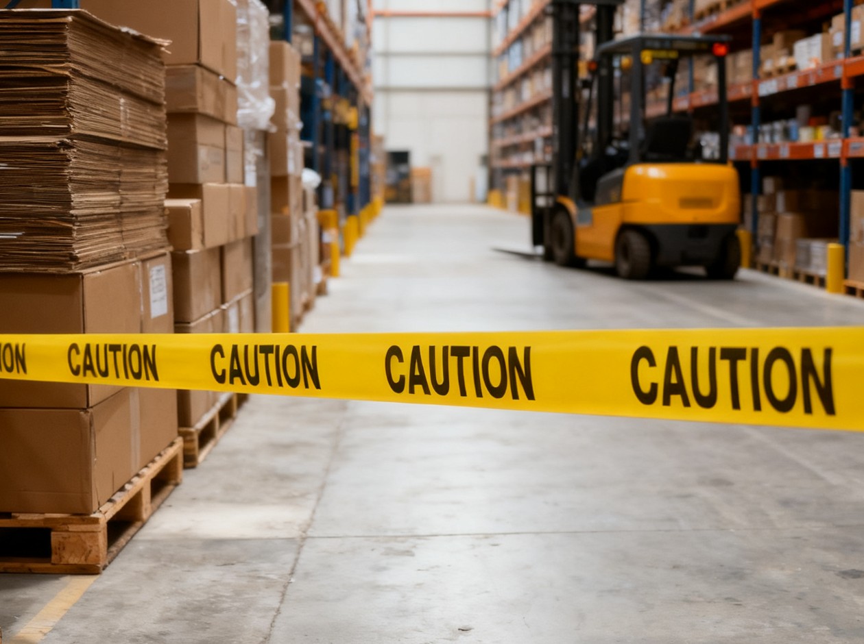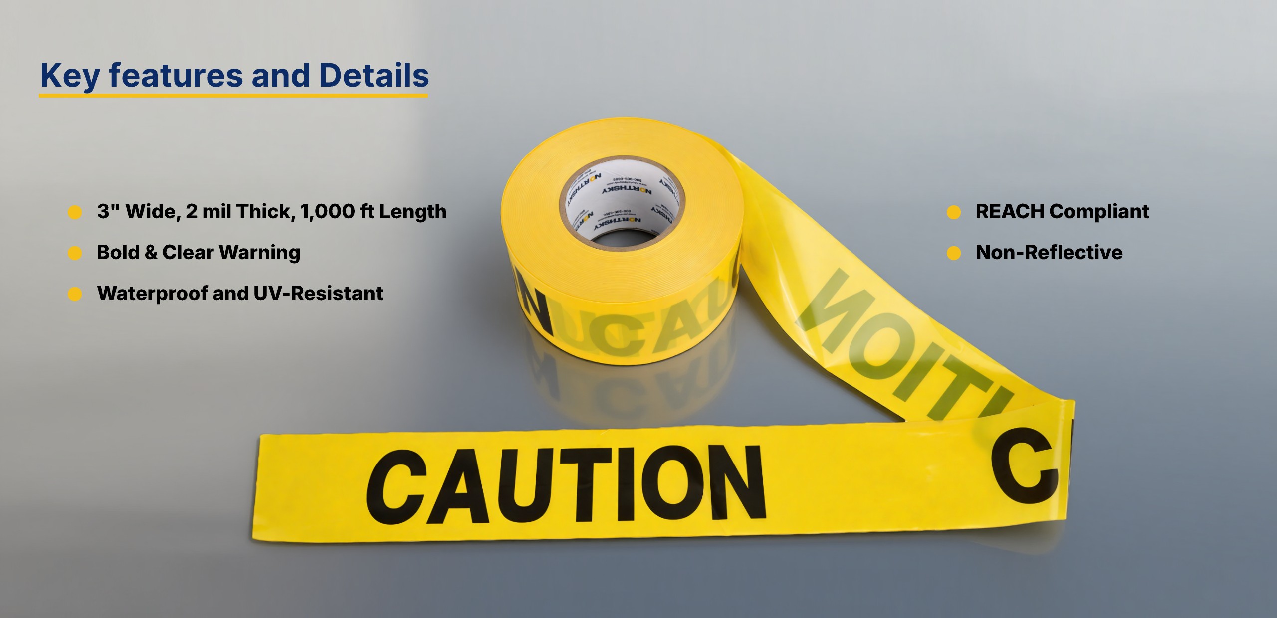 Bright yellow 3" wide tape with bold black "CAUTION" lettering provides clear visibility from a distance.