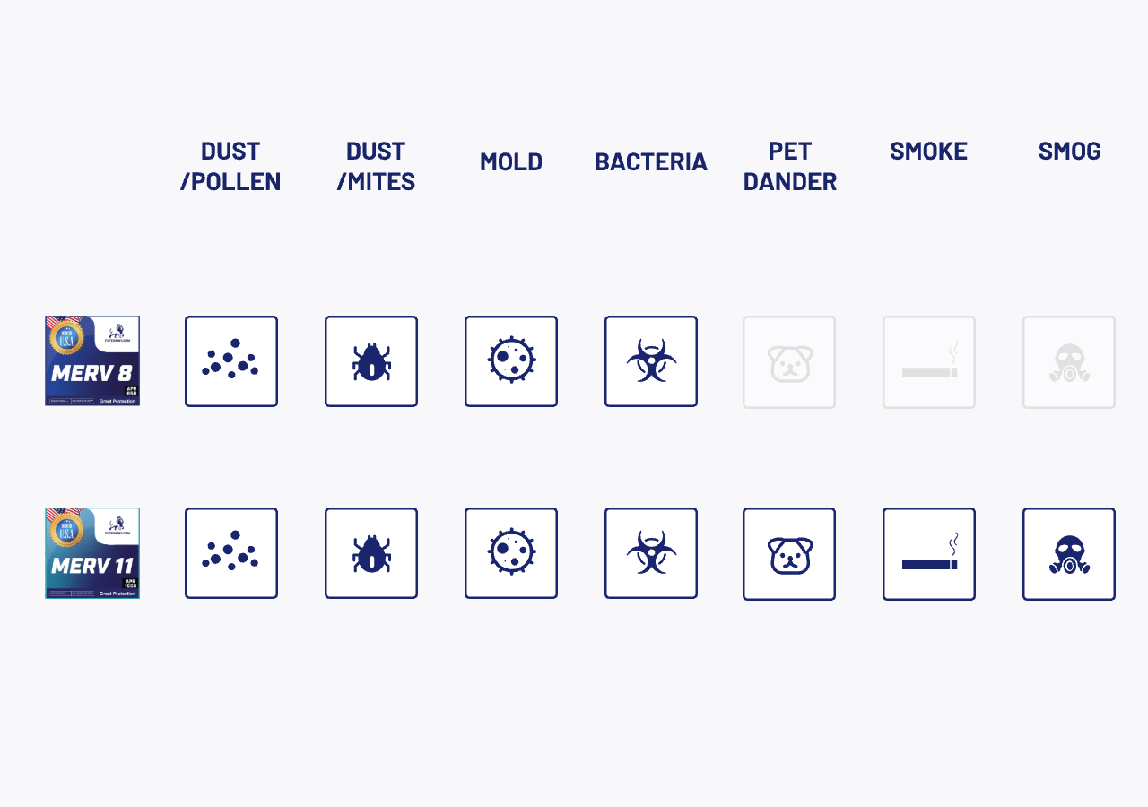MERV 11 captures finer particulates as small as 1-3 microns.